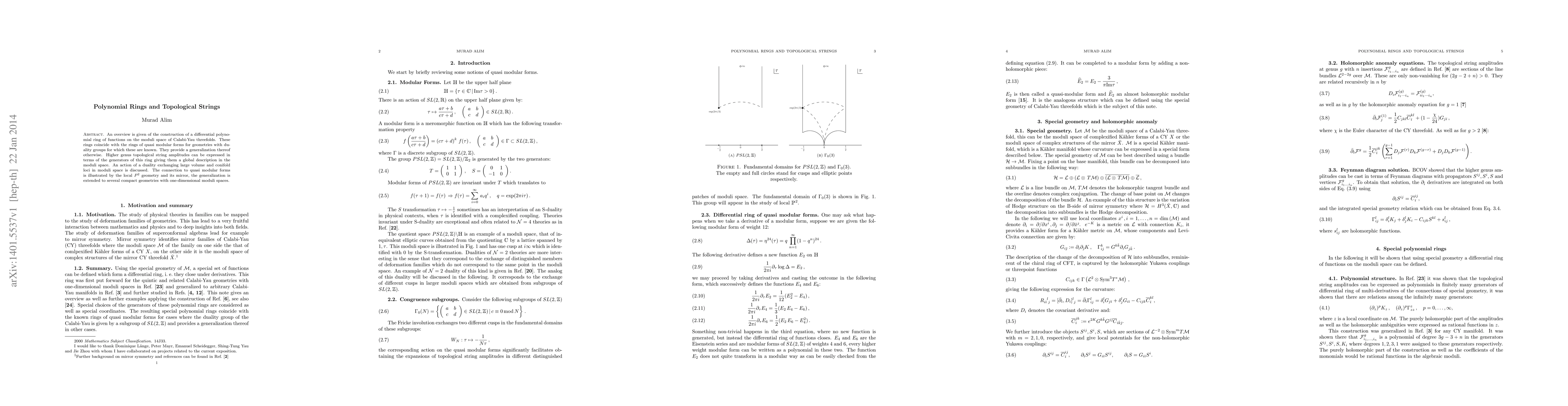 An overview is given of the construction of a differential polynomial ring of functions on the moduli space of Calabi-Yau threefolds. These rings coincide with the rings of quasi modular forms for geometries with duality groups for which these are known. They provide a generalization thereof otherwise. Higher genus topological string amplitudes can be expressed in terms of the generators of this ring giving them a global description in the moduli space. An action of a duality exchanging large volume and conifold loci in moduli space is discussed. The connection to quasi modular forms is illustrated by the local P^2 geometry and its mirror, the generalization is extended to several compact geometries with one-dimensional moduli spaces.