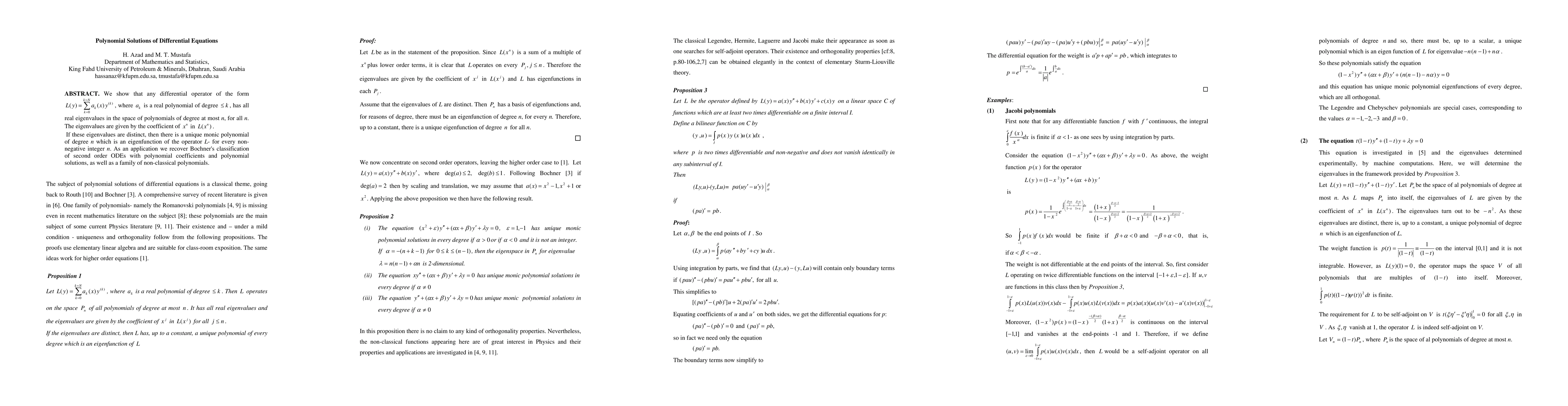We show that any differential operator of the form $L(y)=\sum_{k=0}^{k=N} a_{k}(x) y^{(k)}$, where $a_k$ is a real polynomial of degree $\leq k$, has all real eigenvalues in the space of polynomials of degree at most n, for all n. The eigenvalues are given by the coefficient of $x^n$ in $L(x^{n})$. If these eigenvalues are distinct, then there is a unique monic polynomial of degree n which is an eigenfunction of the operator L- for every non-negative integer n. As an application we recover Bochner's classification of second order ODEs with polynomial coefficients and polynomial solutions, as well as a family of non-classical polynomials.