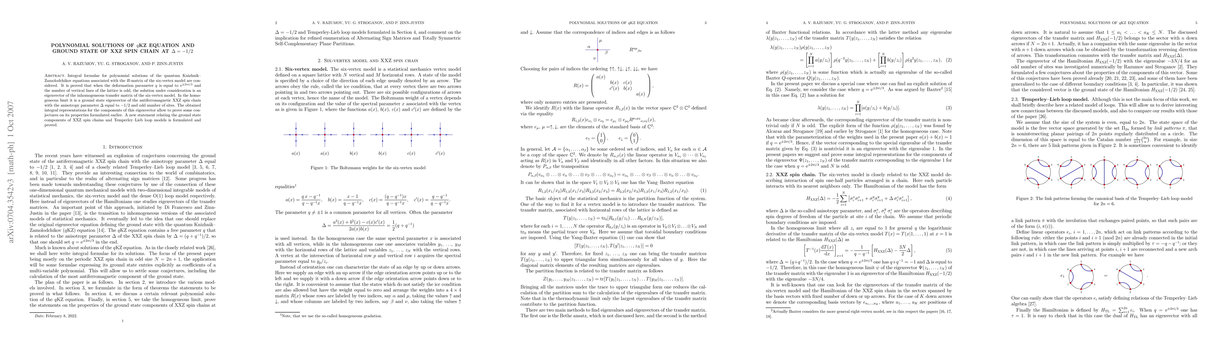 This paper explores polynomial solutions to the quantum Knizhnik-Zamolodchikov equations linked to the six-vertex model's R-matrix, proving they are eigenvectors of the six-vertex model's transfer matrix. In the homogeneous limit, these solutions correspond to ground state eigenvectors of the XXZ spin chain with an anisotropy parameter of -1/2.