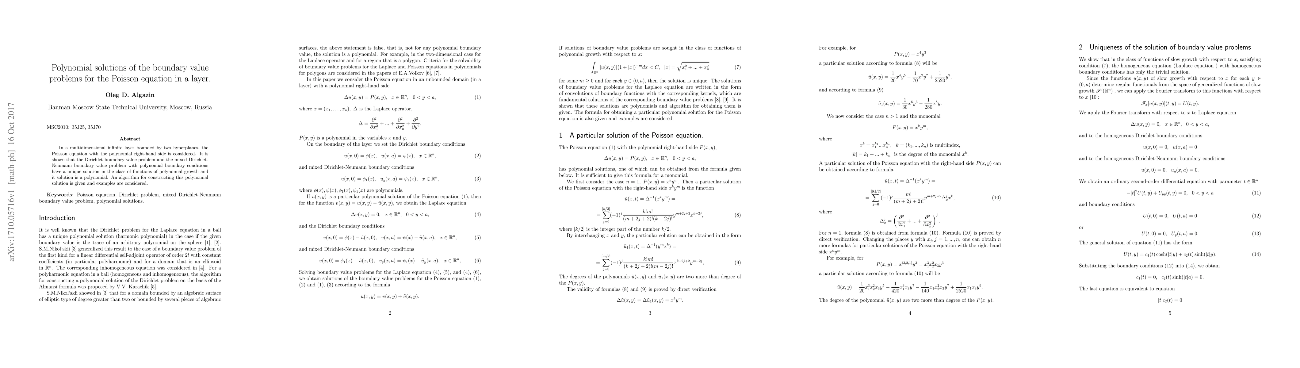 This paper demonstrates that the Poisson equation in a multidimensional infinite layer with polynomial boundary conditions has a unique polynomial solution. An algorithm for constructing this solution is provided, along with illustrative examples.