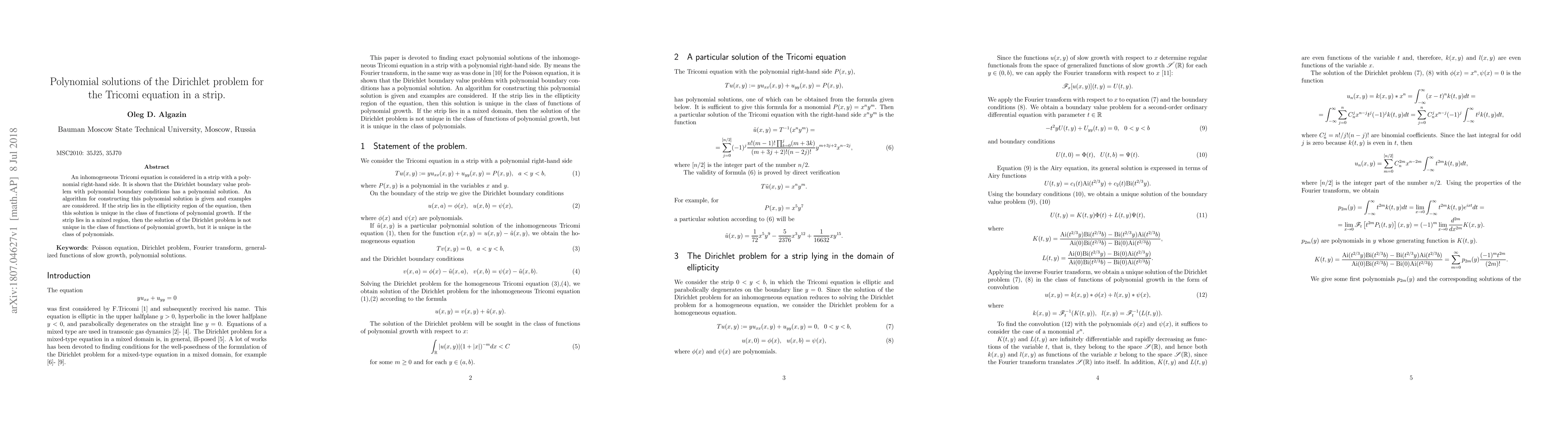An inhomogeneous Tricomi equation is considered in a strip with a polynomial right-hand side. It is shown that the Dirichlet boundary value problem with polynomial boundary conditions has a polynomial solution. An algorithm for constructing this polynomial solution is given and examples are considered. If the strip lies in the ellipticity region of the equation, then this solution is unique in the class of functions of polynomial growth. If the strip lies in a mixed region, then the solution of the Dirichlet problem is not unique in the class of functions of polynomial growth, but it is unique in the class of polynomials.