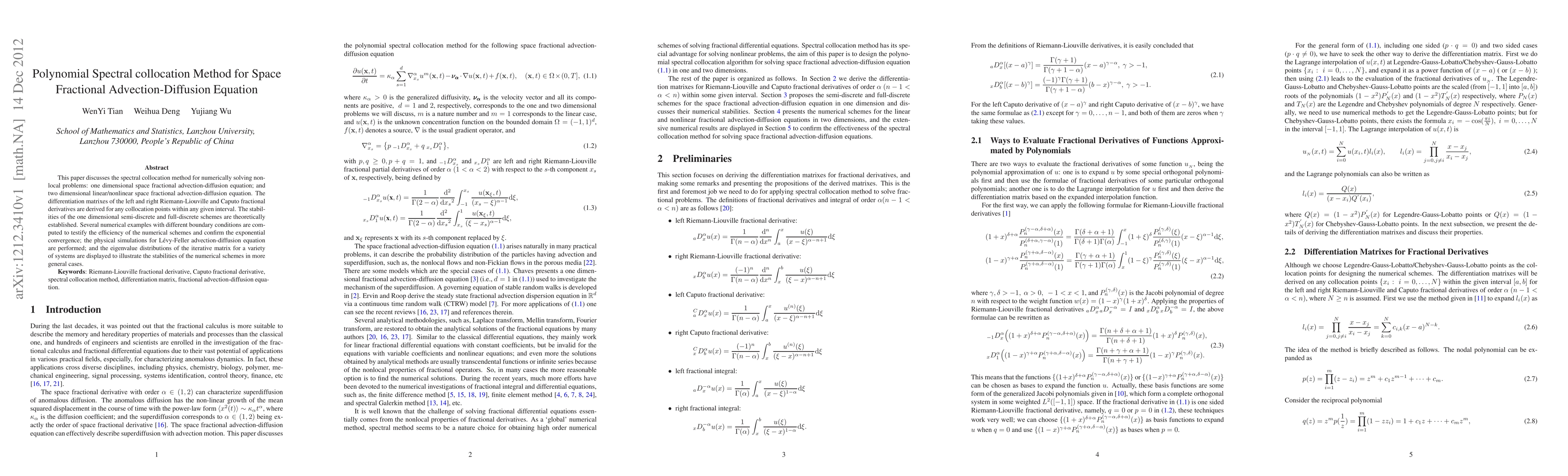 This paper proposes a polynomial spectral collocation method for solving 1D and 2D space fractional advection-diffusion equations, deriving differentiation matrices for fractional derivatives and establishing theoretical stability. Numerical examples confirm exponential convergence and illustrate the method's efficiency.