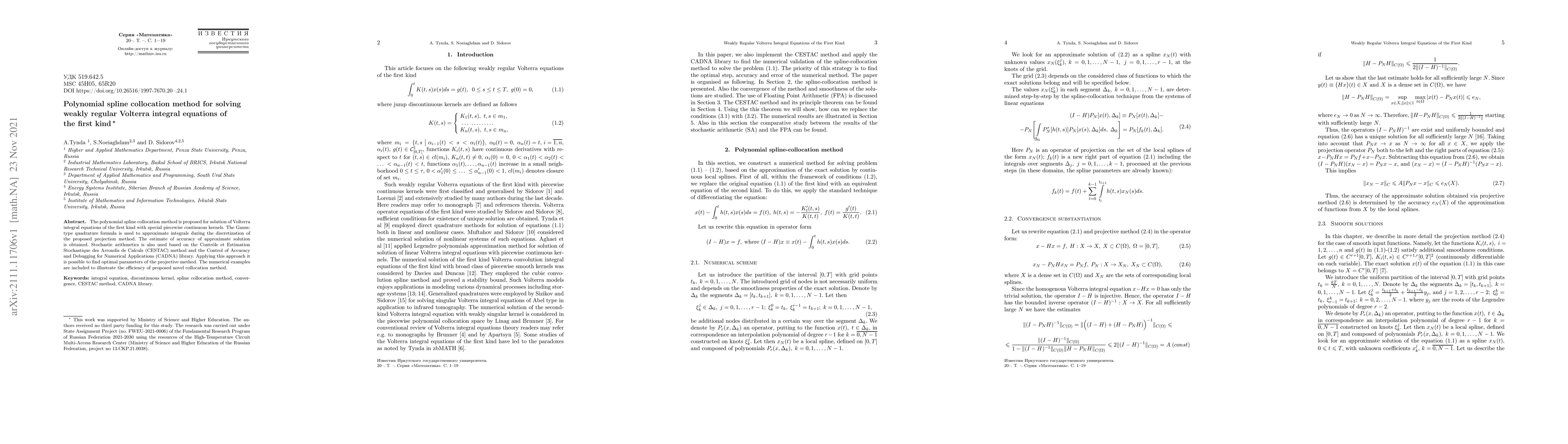 The paper proposes a polynomial spline collocation method for solving weakly regular Volterra integral equations of the first kind, utilizing Gauss-type quadrature for integration and stochastic arithmetic for accuracy control. Numerical examples demonstrate the efficiency of the new approach.