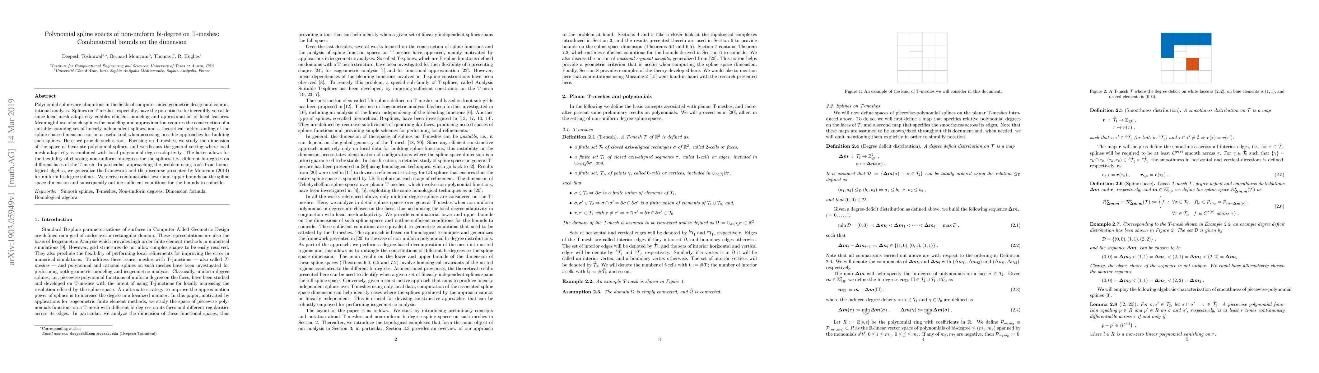 This paper investigates the dimension of polynomial spline spaces on T-meshes with non-uniform bi-degrees, providing combinatorial bounds. It generalizes previous work on uniform bi-degree splines and uses tools from homological algebra to derive these bounds for adaptive mesh and polynomial degree modeling.