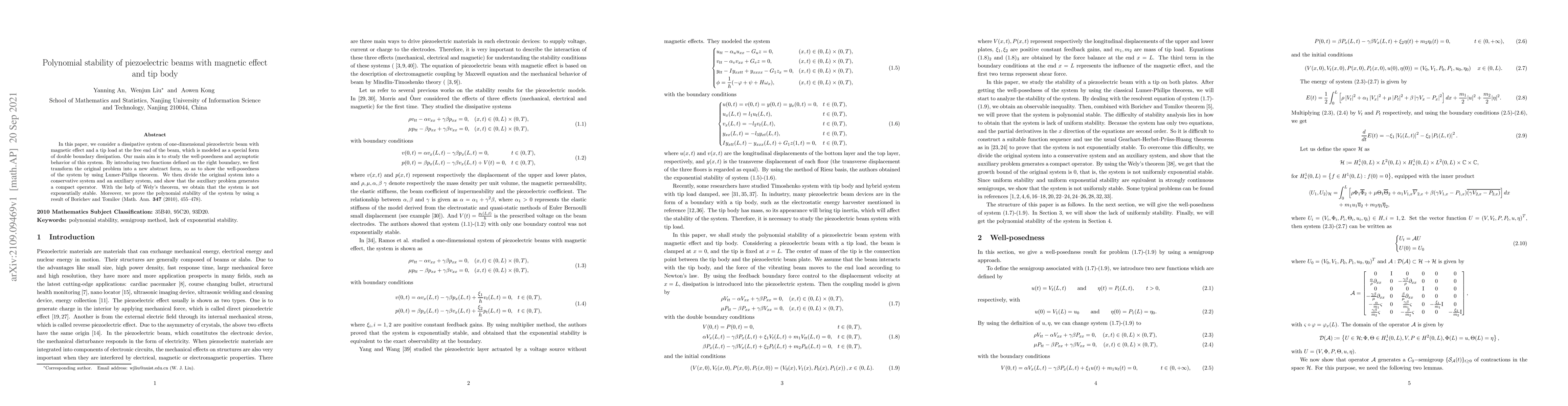 In this paper, we consider a dissipative system of one-dimensional piezoelectric beam with magnetic effect and a tip load at the free end of the beam, which is modeled as a special form of double boundary dissipation. Our main aim is to study the well-posedness and asymptotic behavior of this system. By introducing two functions defined on the right boundary, we first transform the original problem into a new abstract form, so as to show the well-posedness of the system by using Lumer-Philips theorem. We then divide the original system into a conservative system and an auxiliary system, and show that the auxiliary problem generates a compact operator. With the help of Wely's theorem, we obtain that the system is not exponentially stable. Moreover, we prove the polynomial stability of the system by using a result of Borichev and Tomilov (Math. Ann. {\bf 347} (2010), 455--478).