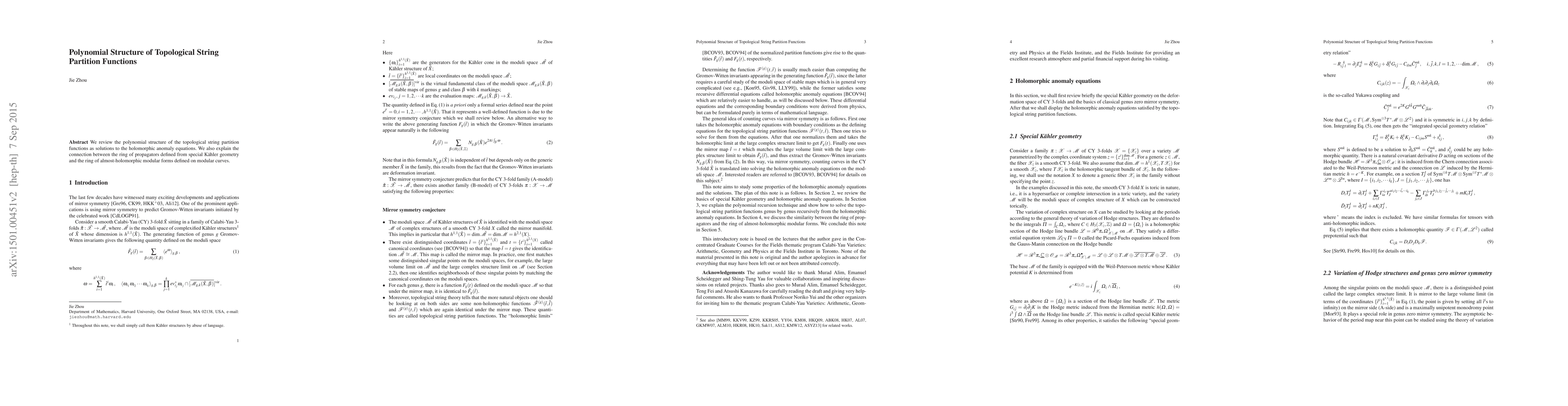 We review the polynomial structure of the topological string partition functions as solutions to the holomorphic anomaly equations. We also explain the connection between the ring of propagators defined from special K\"ahler geometry and the ring of almost-holomorphic modular forms defined on modular curves.