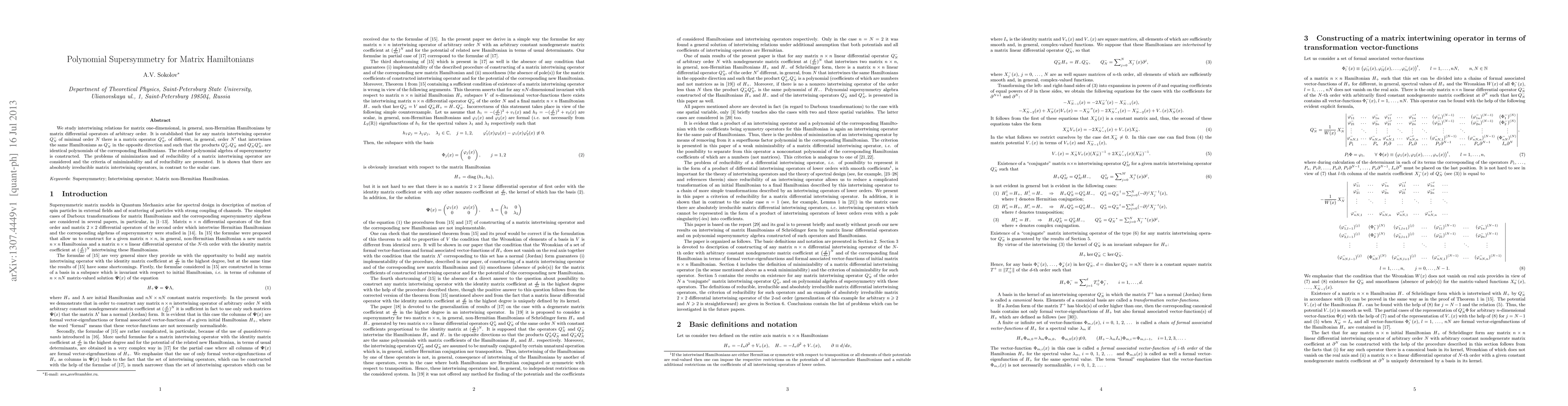 We study intertwining relations for matrix one-dimensional, in general, non-Hermitian Hamiltonians by matrix differential operators of arbitrary order. It is established that for any matrix intertwining operator Q_N^- of minimal order N there is a matrix operator Q_{N'}^+ of different, in general, order N' that intertwines the same Hamiltonians as Q_N^- in the opposite direction and such that the products Q_{N'}^+Q_N^- and Q_N^-Q_{N'}^+ are identical polynomials of the corresponding Hamiltonians. The related polynomial algebra of supersymmetry is constructed. The problems of minimization and of reducibility of a matrix intertwining operator are considered and the criteria of minimizability and of reducibility are presented. It is shown that there are absolutely irreducible matrix intertwining operators, in contrast to the scalar case.