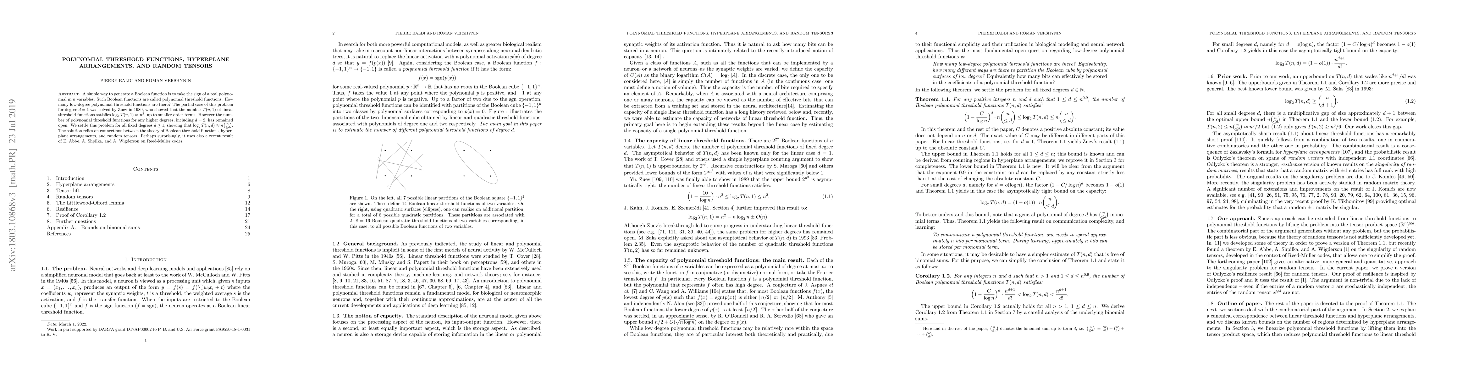 This paper determines the number of low-degree polynomial threshold functions for any fixed degree $d \ge 1$, showing $\log_2 T(n,d) \approx n \binom{n}{\le d}$. The solution leverages connections between Boolean threshold functions, hyperplane arrangements, and random tensors, along with results on Reed-Muller codes.