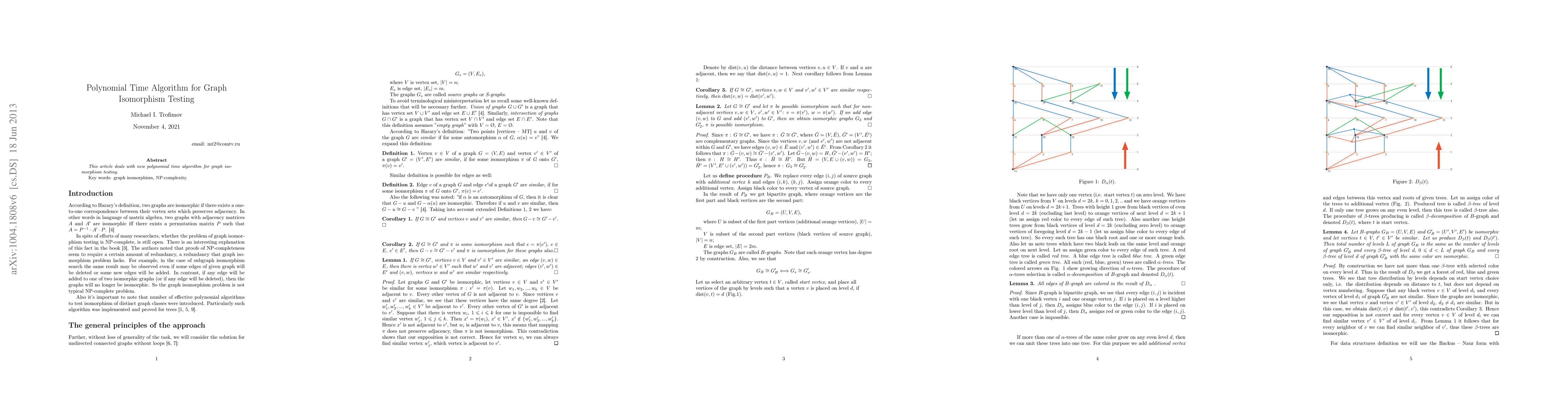 Title: Polynomial Time Algorithm for Graph Isomorphism Testing Summary: This paper introduces an innovative polynomial time algorithm designed to solve the graph isomorphism problem efficiently, marking a significant advancement in computational graph theory.