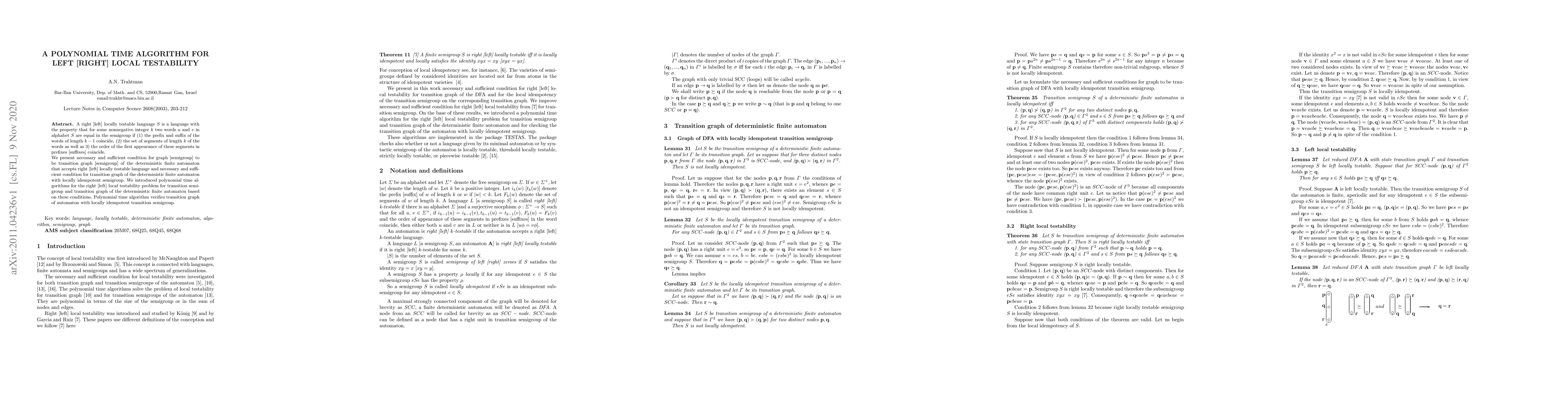 A right [left] locally testable language S is a language with the property that for some non negative integer k two words u and v in alphabet S are equal in the semi group if (1) the prefix and suffix of the words of length k coincide, (2) the set of segments of length k of the words as well as 3) the order of the first appearance of these segments in prefixes [suffixes] coincide. We present necessary and sufficient condition for graph [semi group] to be transition graph [semi group] of the deterministic finite automaton that accepts right [left] locally testable language and necessary and sufficient condition for transition graph of the deterministic finite automaton with locally idempotent semi group. We introduced polynomial time algorithms for the right [left] local testable problem for transition semi group and transition graph of the deterministic finite automaton based on these conditions. Polynomial time algorithm verifies transition graph of automaton with locally idempotent transition semi group.