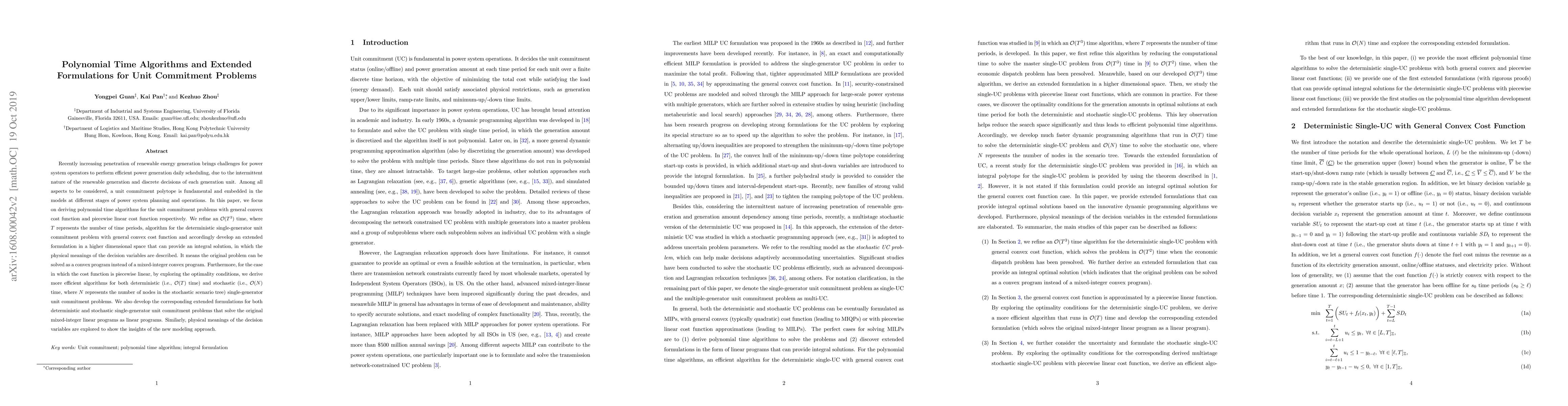 This paper develops polynomial time algorithms for unit commitment problems, focusing on both general convex and piecewise linear cost functions. It refines an $\mathcal{O}(T^3)$ algorithm for deterministic single-generator problems and introduces extended formulations that convert the mixed-integer convex program into a convex program. For piecewise linear cost functions, it proposes more efficient algorithms with complexities $\mathcal{O}(T)$ and $\mathcal{O}(N)$ for deterministic and stochastic cases, respectively.