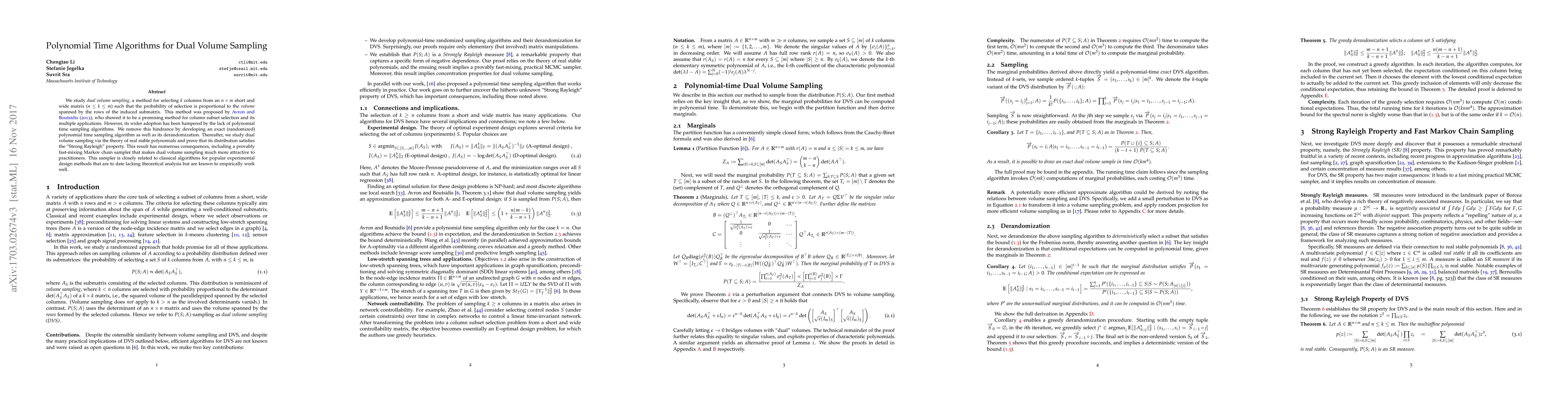 Researchers develop a polynomial time algorithm for dual volume sampling, improving its adoption in column subset selection and experimental design applications. The new method offers fast-mixing Markov chain samplers with theoretical guarantees.