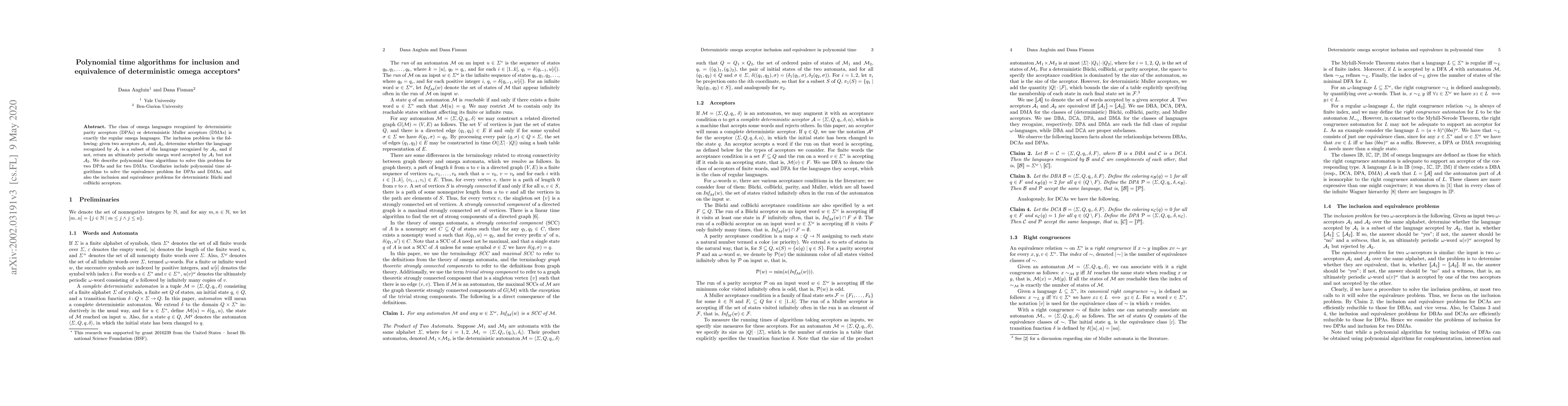 The paper presents polynomial time algorithms for solving the inclusion and equivalence problems for deterministic omega acceptors, including DPAs and DMAs, extending these solutions to Buechi and coBuechi acceptors. The inclusion problem specifically determines if one acceptor’s language is a subset of another's, with a method to identify counterexamples if not.
