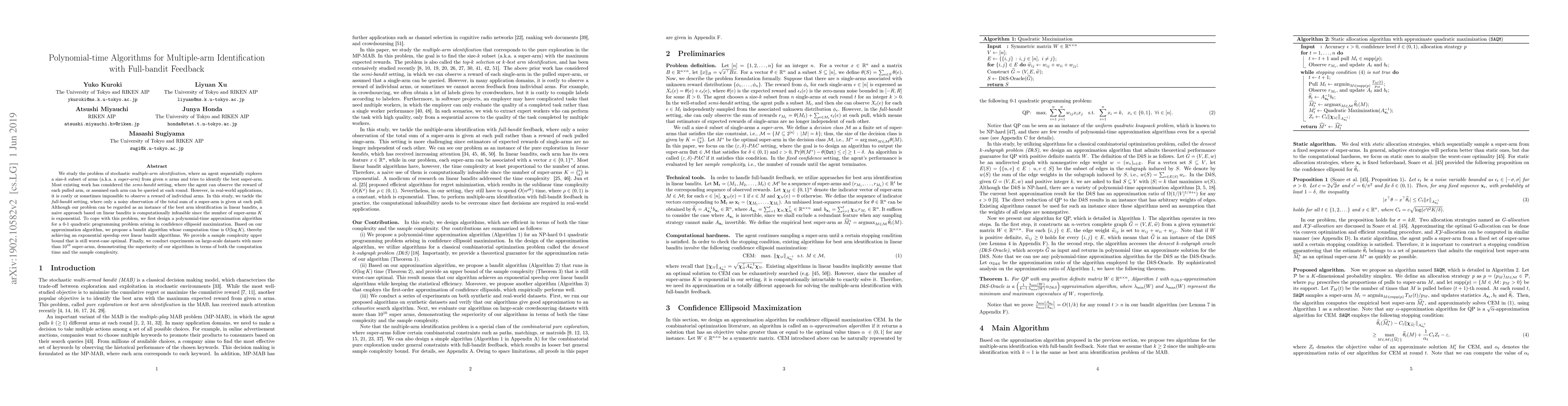 This paper proposes polynomial-time algorithms for stochastic combinatorial pure exploration under full-bandit feedback, addressing the challenge of identifying the best super arm when only the sum of rewards is observable. The authors introduce an efficient algorithm for the combinatorial setting and validate their approach through experiments on both synthetic and real-world datasets.
