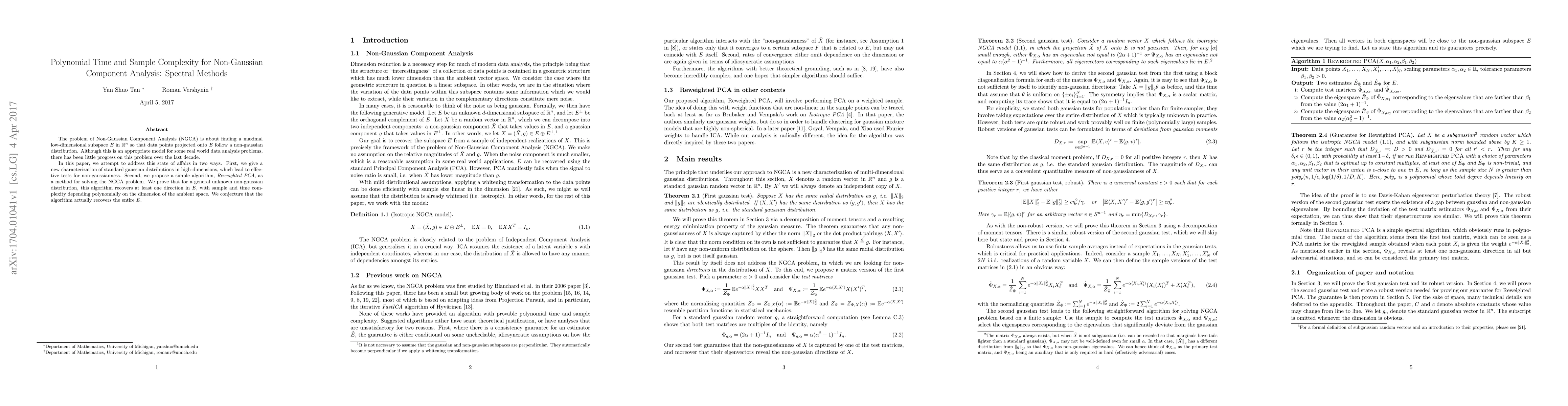 The problem of Non-Gaussian Component Analysis (NGCA) is about finding a maximal low-dimensional subspace $E$ in $\mathbb{R}^n$ so that data points projected onto $E$ follow a non-gaussian distribution. Although this is an appropriate model for some real world data analysis problems, there has been little progress on this problem over the last decade. In this paper, we attempt to address this state of affairs in two ways. First, we give a new characterization of standard gaussian distributions in high-dimensions, which lead to effective tests for non-gaussianness. Second, we propose a simple algorithm, \emph{Reweighted PCA}, as a method for solving the NGCA problem. We prove that for a general unknown non-gaussian distribution, this algorithm recovers at least one direction in $E$, with sample and time complexity depending polynomially on the dimension of the ambient space. We conjecture that the algorithm actually recovers the entire $E$.