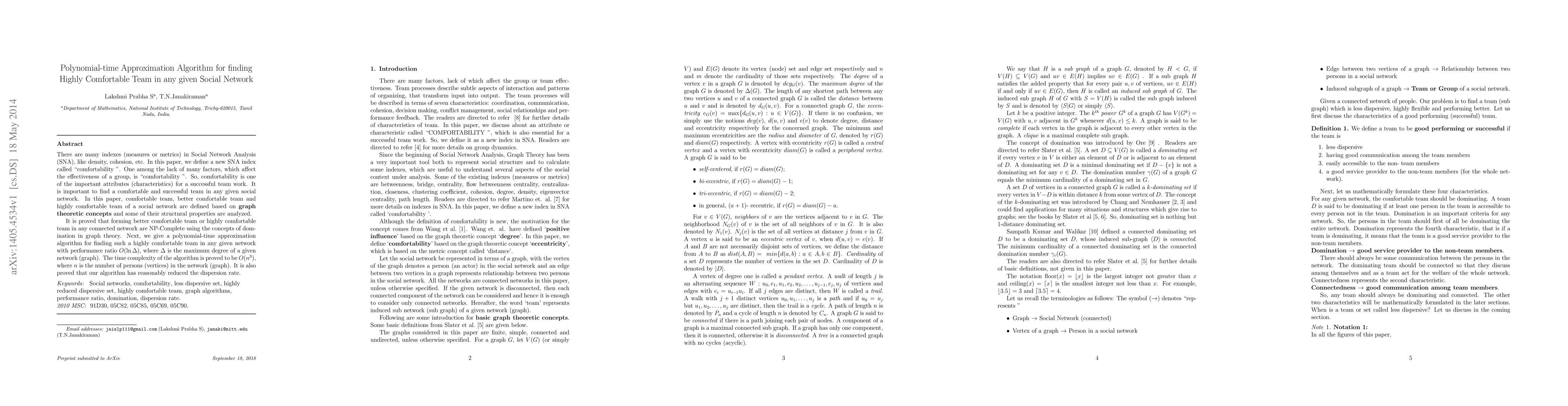 There are many indexes (measures or metrics) in Social Network Analysis (SNA), like density, cohesion, etc. In this paper, we define a new SNA index called "comfortability". One among the lack of many factors, which affect the effectiveness of a group, is "comfortability". So, comfortability is one of the important attributes (characteristics) for a successful team work. It is important to find a comfortable and successful team in any given social network. In this paper, comfortable team, better comfortable team and highly comfortable team of a social network are defined based on \textbf{graph theoretic concepts} and some of their structural properties are analyzed. It is proved that forming better comfortable team or highly comfortable team in any connected network are NP-Complete using the concepts of domination in graph theory. Next, we give a polynomial-time approximation algorithm for finding such a highly comfortable team in any given network with performance ratio O(\ln \Delta), where \Delta is the maximum degree of a given network (graph). The time complexity of the algorithm is proved to be O(n^{3}), where n is the number of persons (vertices) in the network (graph). It is also proved that our algorithm has reasonably reduced the dispersion rate.