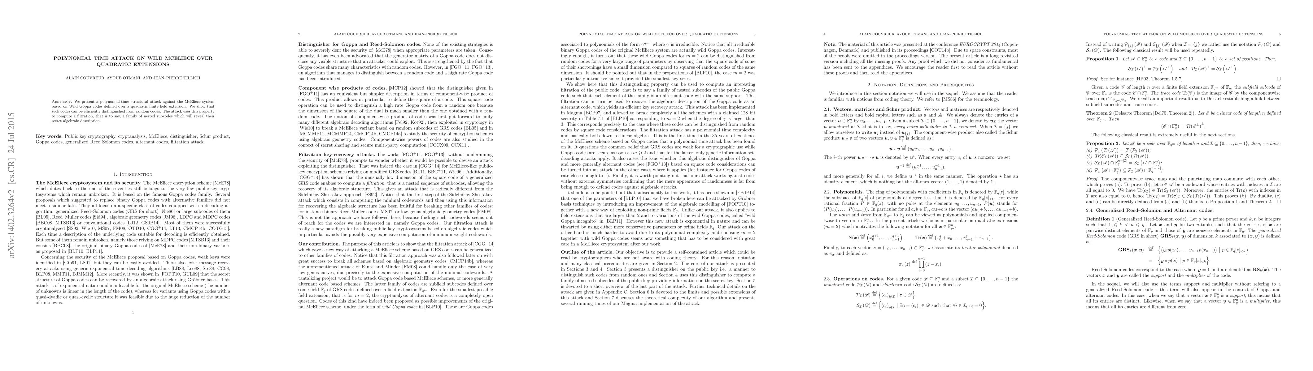 Summary: This paper details a polynomial time attack on the McEliece cryptosystem using Wild Goppa codes over quadratic extensions, exploiting the distinguishability of these codes from random ones to reveal their secret algebraic structure through a filtration process.