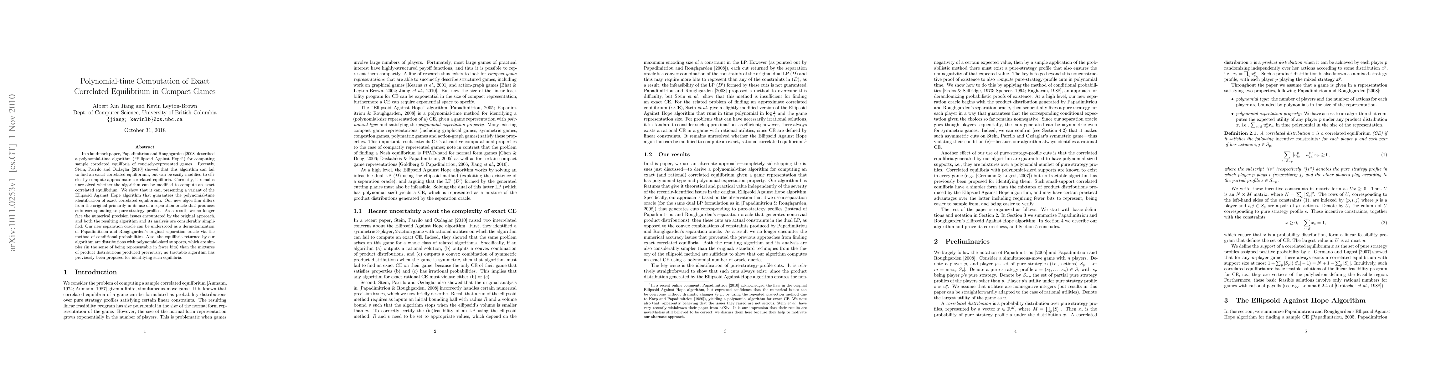 This paper presents a polynomial-time algorithm to compute exact correlated equilibria in compact games, addressing the limitations of previous methods that only found approximate solutions. The new algorithm uses a separation oracle to produce cuts corresponding to pure-strategy profiles, simplifying both the algorithm and its analysis.