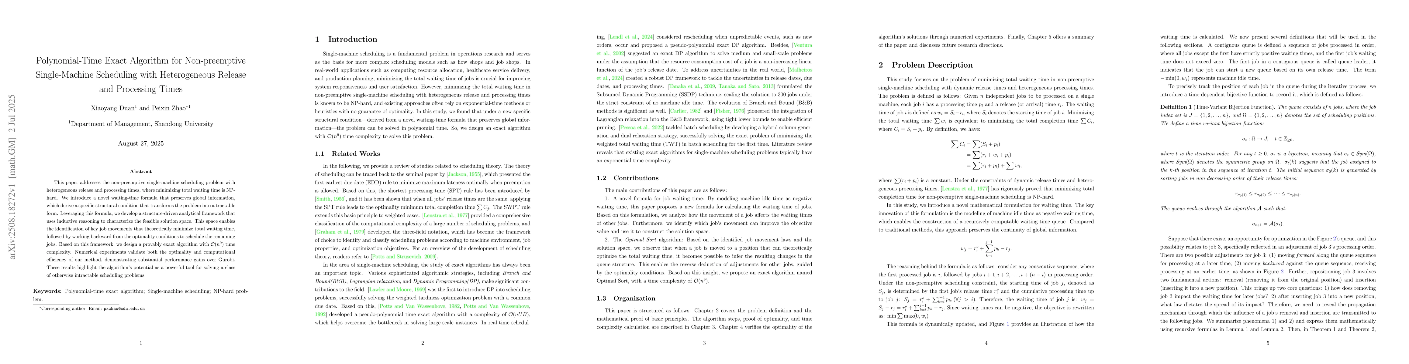 This paper addresses the non-preemptive single-machine scheduling problem with heterogeneous release and processing times, where minimizing total waiting time is NP-hard. We introduce a novel waiting-time formula that preserves global information, which derive a specific structural condition that transforms the problem into a tractable form. Leveraging this formula, we develop a structure-driven analytical framework that uses inductive reasoning to characterize the feasible solution space. This space enables the identification of key job movements that theoretically minimize total waiting time, followed by working backward from the optimality conditions to schedule the remaining jobs. Based on this framework, we design a provably exact algorithm with $\mathcal{O}(n^9)$ time complexity. Numerical experiments validate both the optimality and computational efficiency of our method, demonstrating substantial performance gains over Gurobi. These results highlight the algorithm's potential as a powerful tool for solving a class of otherwise intractable scheduling problems.