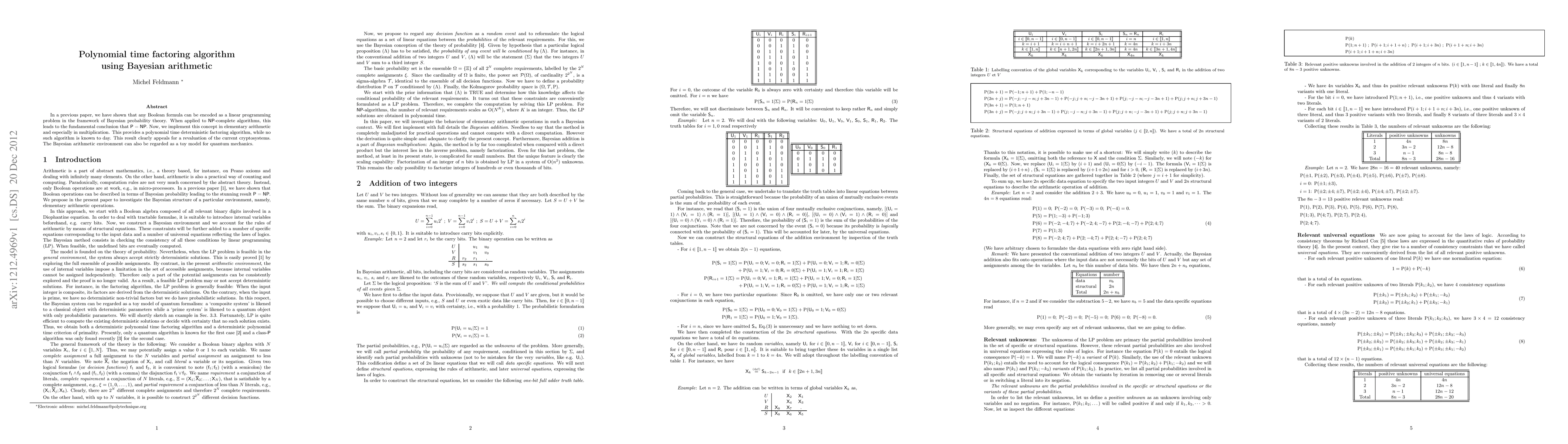 In a previous paper, we have shown that any Boolean formula can be encoded as a linear programming problem in the framework of Bayesian probability theory. When applied to NP-complete algorithms, this leads to the fundamental conclusion that P = NP. Now, we implement this concept in elementary arithmetic and especially in multiplication. This provides a polynomial time deterministic factoring algorithm, while no such algorithm is known to day. This result clearly appeals for a revaluation of the current cryptosystems. The Bayesian arithmetic environment can also be regarded as a toy model for quantum mechanics.