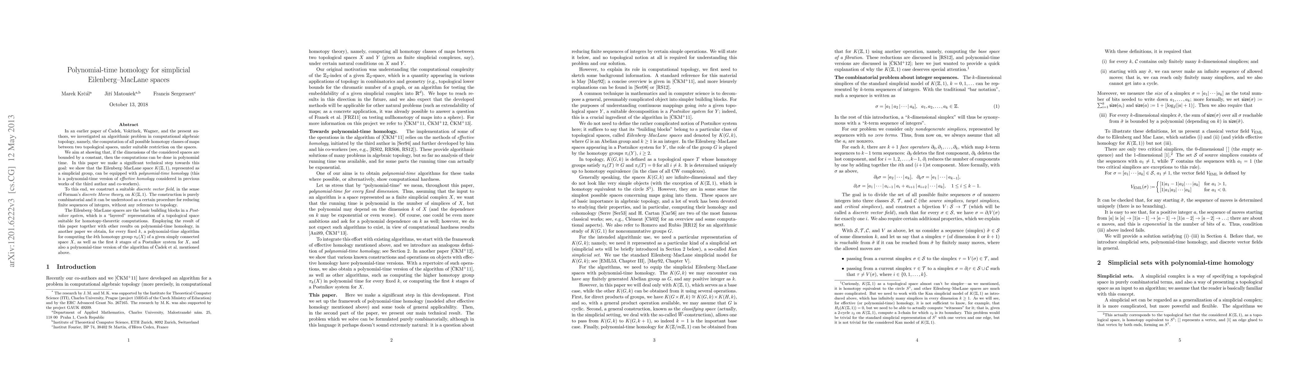 This paper demonstrates that Eilenberg-MacLane spaces K(Z,1) can be equipped with polynomial-time homology using a combinatorial construction based on Forman's discrete Morse theory, paving the way for polynomial-time computation of homotopy classes of maps between topological spaces when dimensions are bounded.