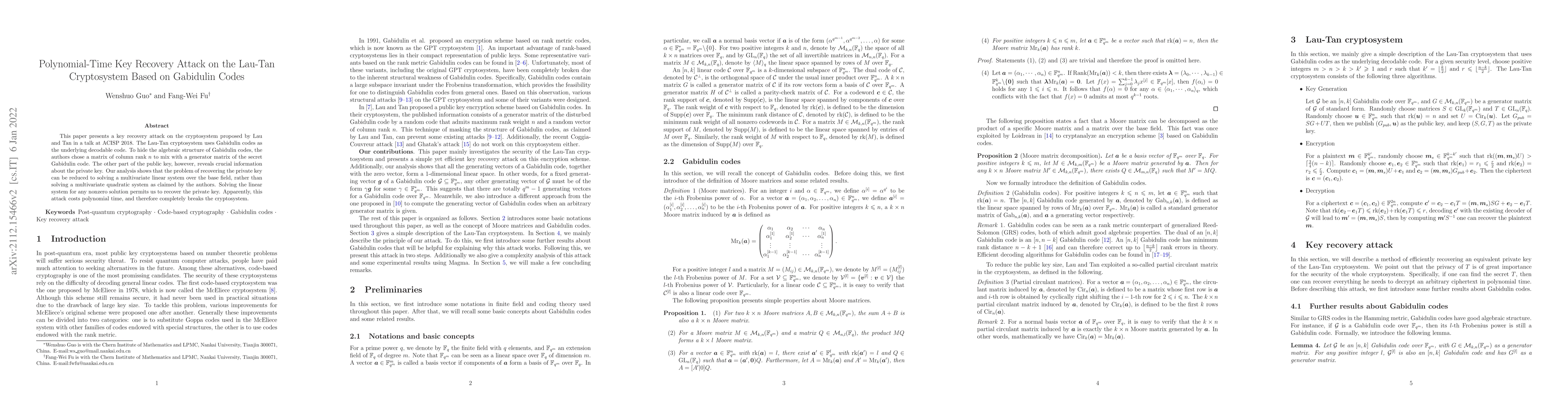 This paper details a polynomial-time key recovery attack on the Lau-Tan cryptosystem, which relies on Gabidulin codes. The authors reveal that solving a multivariate linear system instead of the claimed quadratic system permits efficient private key recovery, undermining the cryptosystem's security.