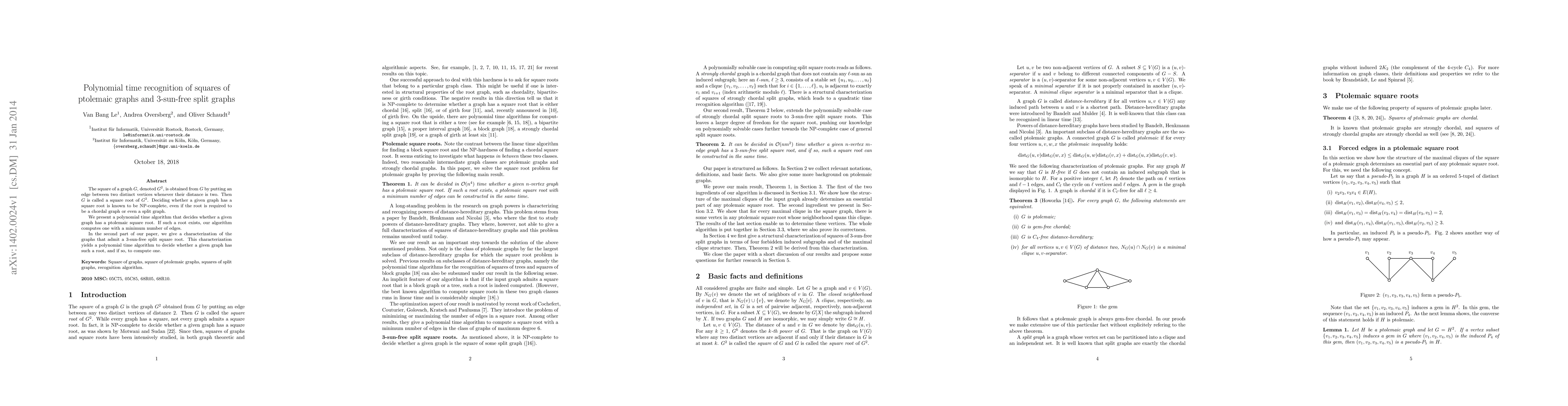 This paper presents a polynomial time algorithm to find square roots of certain types of graphs, including ptolemaic graphs and 3-sun-free split graphs, with significant implications for graph theory and computational complexity.