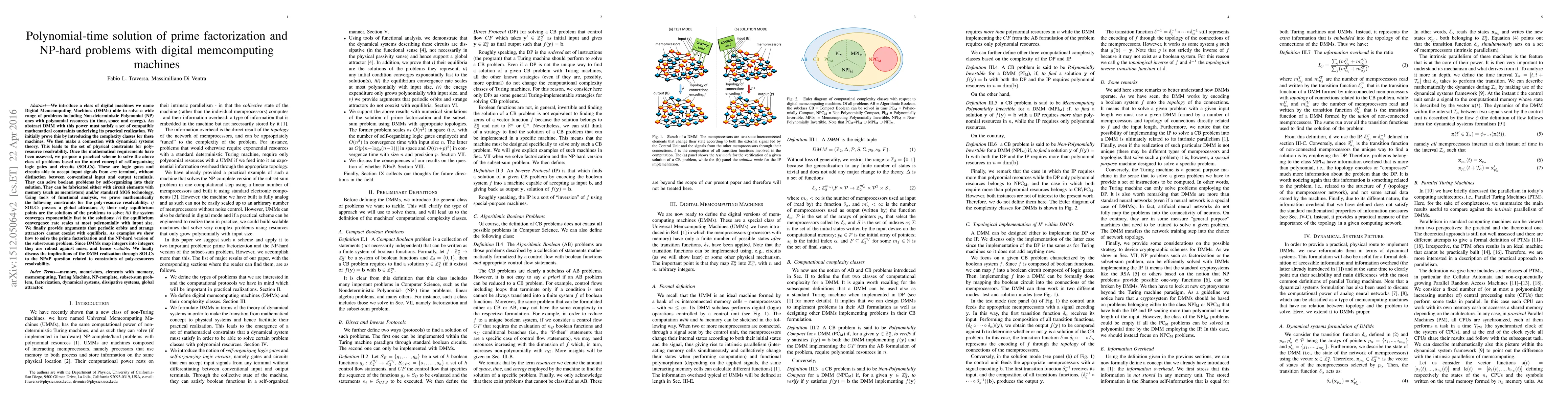 Researchers introduce a new class of digital machines called Digital Memcomputing Machines that can solve complex problems like prime factorization and NP-hard problems in polynomial time using self-organizing logic gates and circuits.