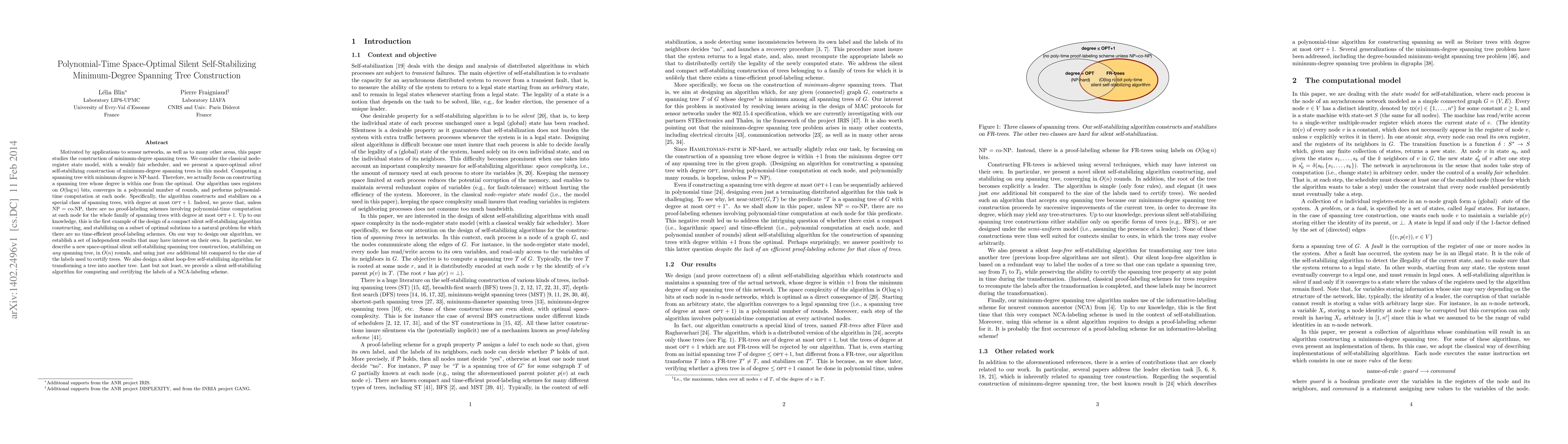 Motivated by applications to sensor networks, as well as to many other areas, this paper studies the construction of minimum-degree spanning trees. We consider the classical node-register state model, with a weakly fair scheduler, and we present a space-optimal \emph{silent} self-stabilizing construction of minimum-degree spanning trees in this model. Computing a spanning tree with minimum degree is NP-hard. Therefore, we actually focus on constructing a spanning tree whose degree is within one from the optimal. Our algorithm uses registers on $O(\log n)$ bits, converges in a polynomial number of rounds, and performs polynomial-time computation at each node. Specifically, the algorithm constructs and stabilizes on a special class of spanning trees, with degree at most $OPT+1$. Indeed, we prove that, unless NP $=$ coNP, there are no proof-labeling schemes involving polynomial-time computation at each node for the whole family of spanning trees with degree at most $OPT+1$. Up to our knowledge, this is the first example of the design of a compact silent self-stabilizing algorithm constructing, and stabilizing on a subset of optimal solutions to a natural problem for which there are no time-efficient proof-labeling schemes. On our way to design our algorithm, we establish a set of independent results that may have interest on their own. In particular, we describe a new space-optimal silent self-stabilizing spanning tree construction, stabilizing on \emph{any} spanning tree, in $O(n)$ rounds, and using just \emph{one} additional bit compared to the size of the labels used to certify trees. We also design a silent loop-free self-stabilizing algorithm for transforming a tree into another tree. Last but not least, we provide a silent self-stabilizing algorithm for computing and certifying the labels of a NCA-labeling scheme.