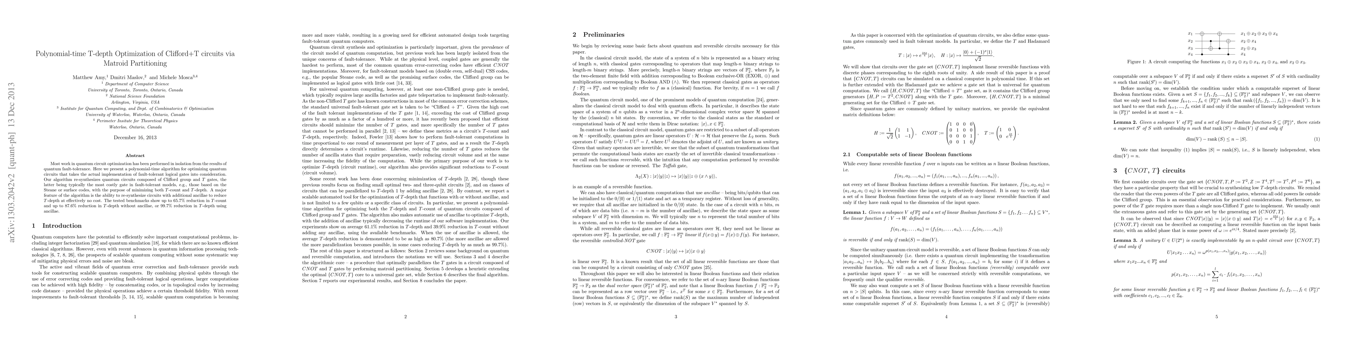 This paper presents a polynomial-time algorithm for optimizing quantum circuits using Clifford+T gates, focusing on minimizing T-count and T-depth while considering fault-tolerant gate implementations. The algorithm effectively reduces T-depth by re-synthesizing circuits with additional ancillae, achieving significant reductions in T-count and T-depth in tested benchmarks.