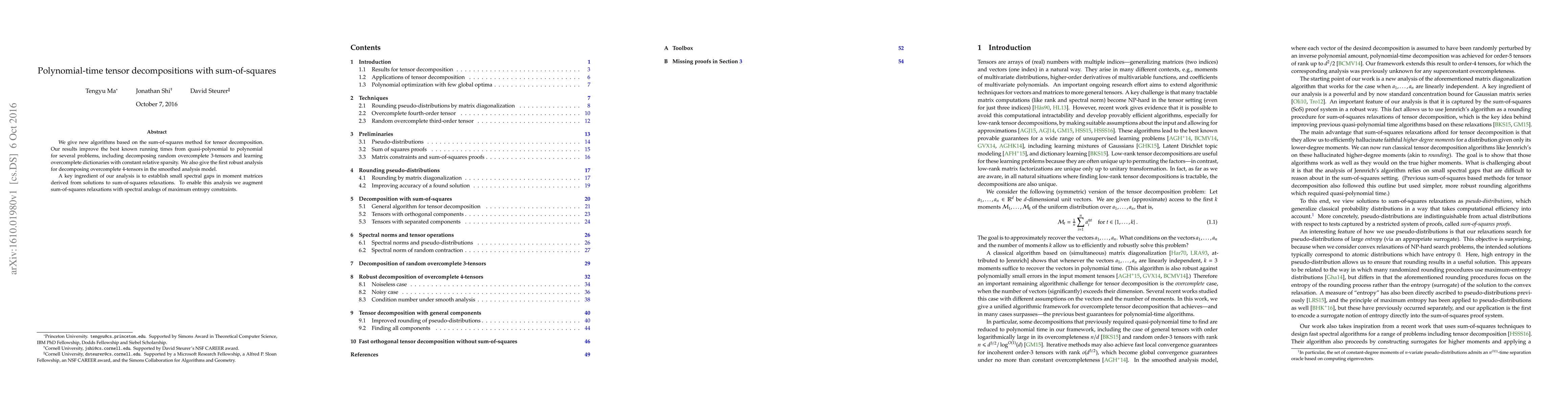 This paper presents new polynomial-time algorithms for tensor decompositions using the sum-of-squares method, improving running times for problems like random overcomplete 3-tensors and learning overcomplete dictionaries. It also introduces the first robust analysis for overcomplete 4-tensors, leveraging small spectral gaps in moment matrices derived from sum-of-squares relaxations.