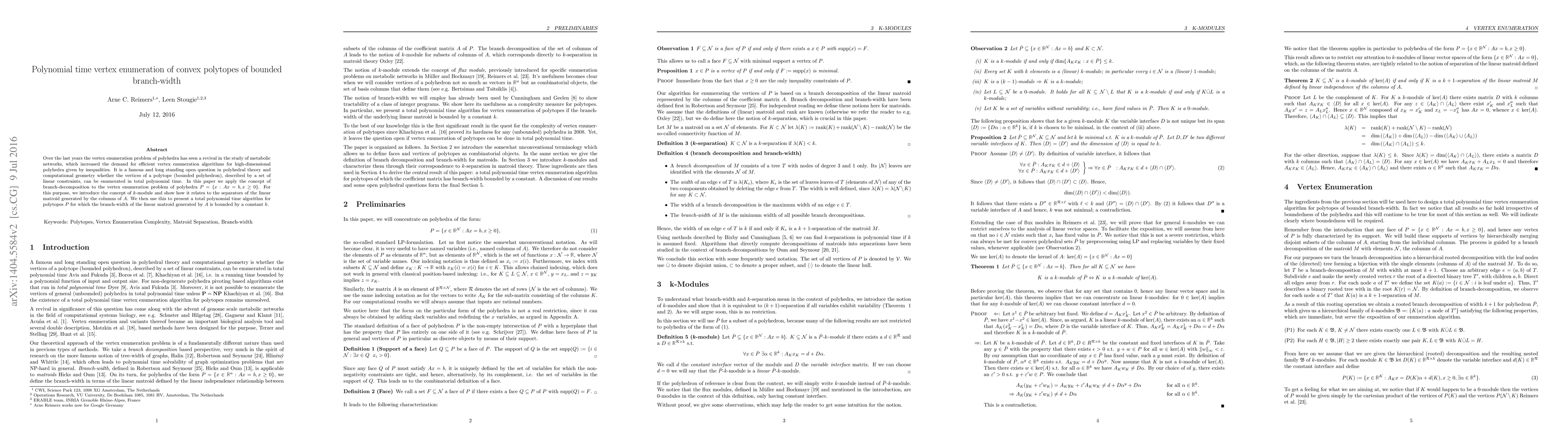 This paper presents a polynomial time algorithm for enumerating vertices of convex polytopes defined by linear inequalities, leveraging the concept of branch-width and $k$-module to handle high-dimensional polyhedra. The method is effective for polytopes with bounded branch-width, addressing a longstanding open question in computational geometry.
