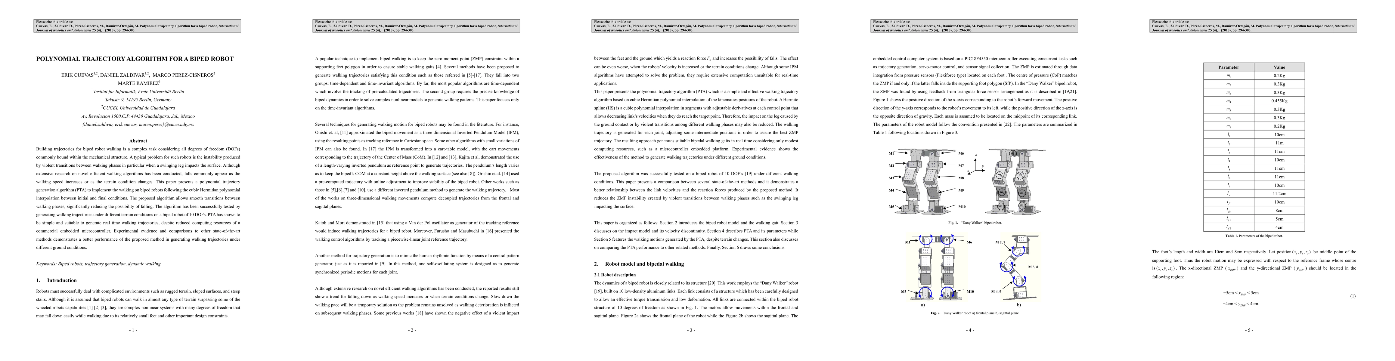 Building trajectories for biped robot walking is a complex task considering all degrees of freedom (DOFs) commonly bound within the mechanical structure. A typical problem for such robots is the instability produced by violent transitions between walking phases in particular when a swinging leg impacts the surface. Although extensive research on novel efficient walking algorithms has been conducted, falls commonly appear as the walking speed increases or as the terrain condition changes. This paper presents a polynomial trajectory generation algorithm (PTA) to implement the walking on biped robots following the cubic Hermitian polynomial interpolation between initial and final conditions. The proposed algorithm allows smooth transitions between walking phases, significantly reducing the possibility of falling. The algorithm has been successfully tested by generating walking trajectories under different terrain conditions on a biped robot of 10 DOFs. PTA has shown to be simple and suitable to generate real time walking trajectories, despite reduced computing resources of a commercial embedded microcontroller. Experimental evidence and comparisons to other state-of-the-art methods demonstrates a better performance of the proposed method in generating walking trajectories under different ground conditions.
