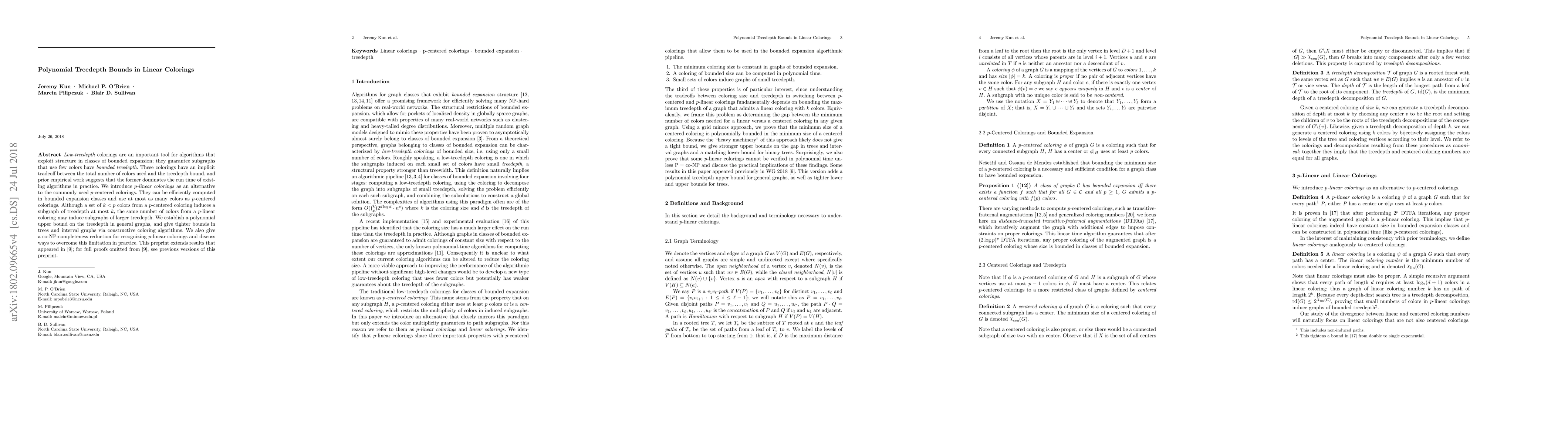 Low-treedepth colorings are an important tool for algorithms that exploit structure in classes of bounded expansion; they guarantee subgraphs that use few colors have bounded treedepth. These colorings have an implicit tradeoff between the total number of colors used and the treedepth bound, and prior empirical work suggests that the former dominates the run time of existing algorithms in practice. We introduce $p$-linear colorings as an alternative to the commonly used $p$-centered colorings. They can be efficiently computed in bounded expansion classes and use at most as many colors as $p$-centered colorings. Although a set of $k