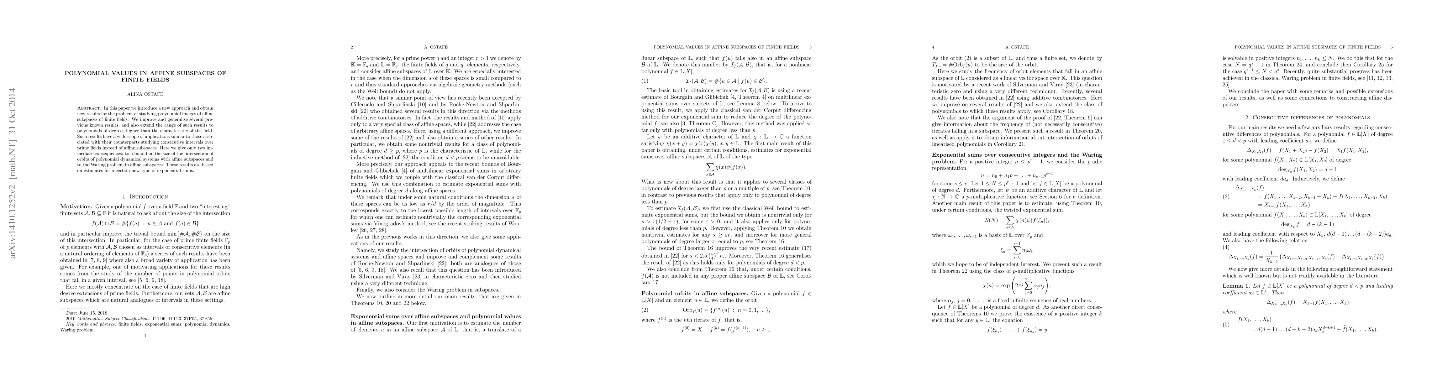 This paper presents a novel approach to studying polynomial images of affine subspaces in finite fields, improving and generalizing previous results to higher-degree polynomials. It introduces new bounds on intersections of polynomial dynamical systems and addresses the Waring problem in affine subspaces, based on estimates of a new type of exponential sums.