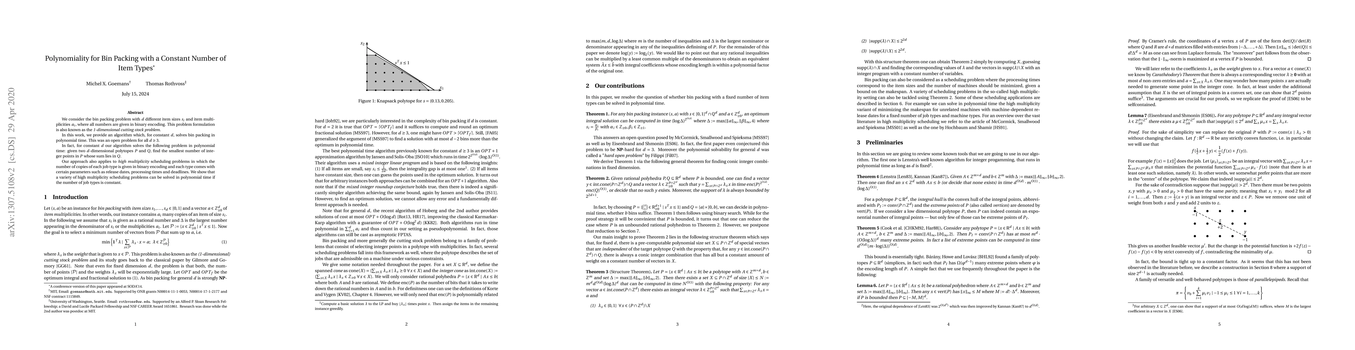 Researchers have developed an algorithm that solves bin packing with a constant number of item types in polynomial time, solving a long-standing open problem for d >= 3. The solution also applies to high multiplicity scheduling problems with certain parameters.