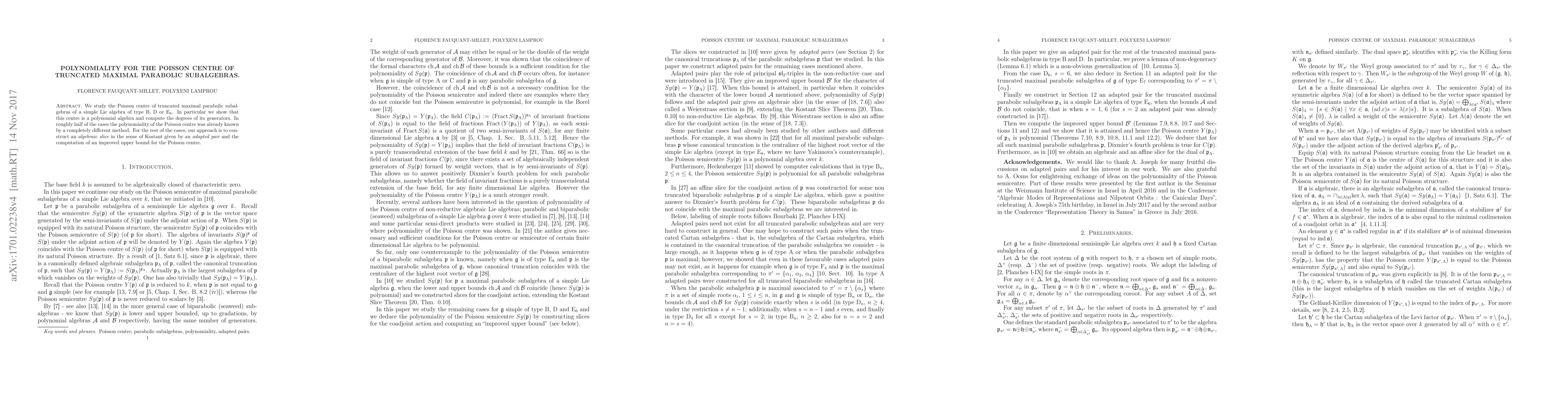 We show that the Poisson centre of truncated maximal parabolic subalgebras of a simple Lie algebra of type B, D and E_6 is a polynomial algebra. In roughly half of the cases the polynomiality of the Poisson centre was already known by a completely different method. For the rest of the cases, our approach is to construct an algebraic slice in the sense of Kostant given by an adapted pair and the computation of an improved upper bound for the Poisson centre.