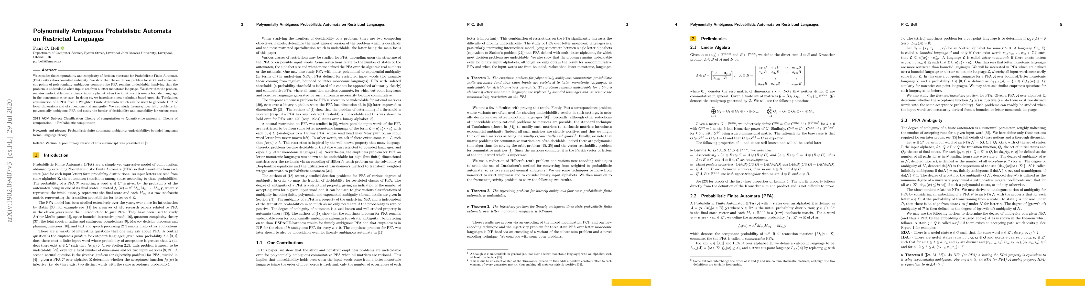 We consider the computability and complexity of decision questions for Probabilistic Finite Automata (PFA) with sub-exponential ambiguity. We show that the emptiness problem for strict and non-strict cut-points of polynomially ambiguous commutative PFA remains undecidable, implying that the problem is undecidable when inputs are from a letter monotonic language. We show that the problem remains undecidable over a binary input alphabet when the input word is over a bounded language, in the noncommutative case. In doing so, we introduce a new technique based upon the Turakainen construction of a PFA from a Weighted Finite Automata which can be used to generate PFA of lower dimensions and of subexponential ambiguity. We also study freeness/injectivity problems for polynomially ambiguous PFA and study the border of decidability and tractability for various cases.
