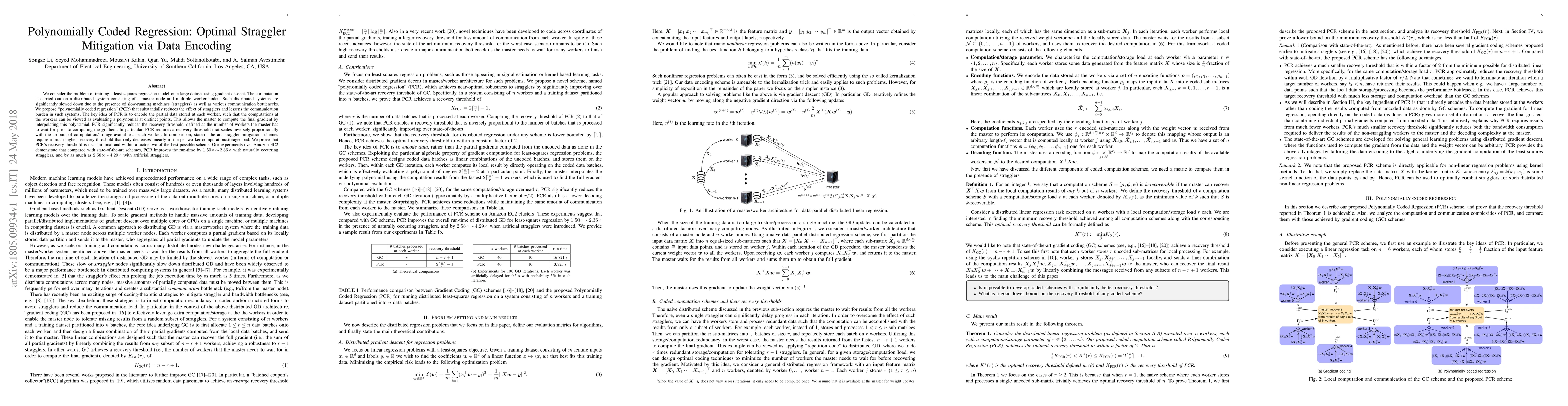 The paper proposes "polynomially coded regression" (PCR) to mitigate stragglers in distributed least-squares regression training, significantly reducing the recovery threshold and communication burden. PCR encodes worker data as polynomial evaluations, allowing the master node to interpolate and compute gradients efficiently, improving runtime by 1.50x to 4.29x compared to state-of-the-art methods.
