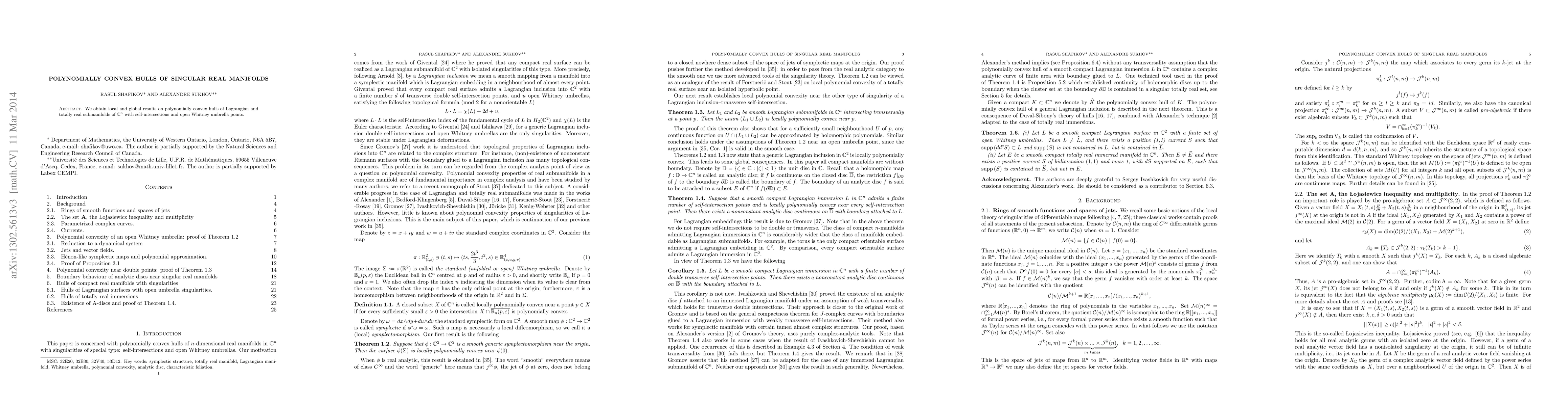 Summary: This paper investigates local and global properties of polynomially convex hulls for singular real manifolds, including Lagrangian and totally real submanifolds of $\mathbb{C}^n$ that feature self-intersections and open Whitney umbrella points. The results provide insights into the structure and behavior of these complex geometric objects.