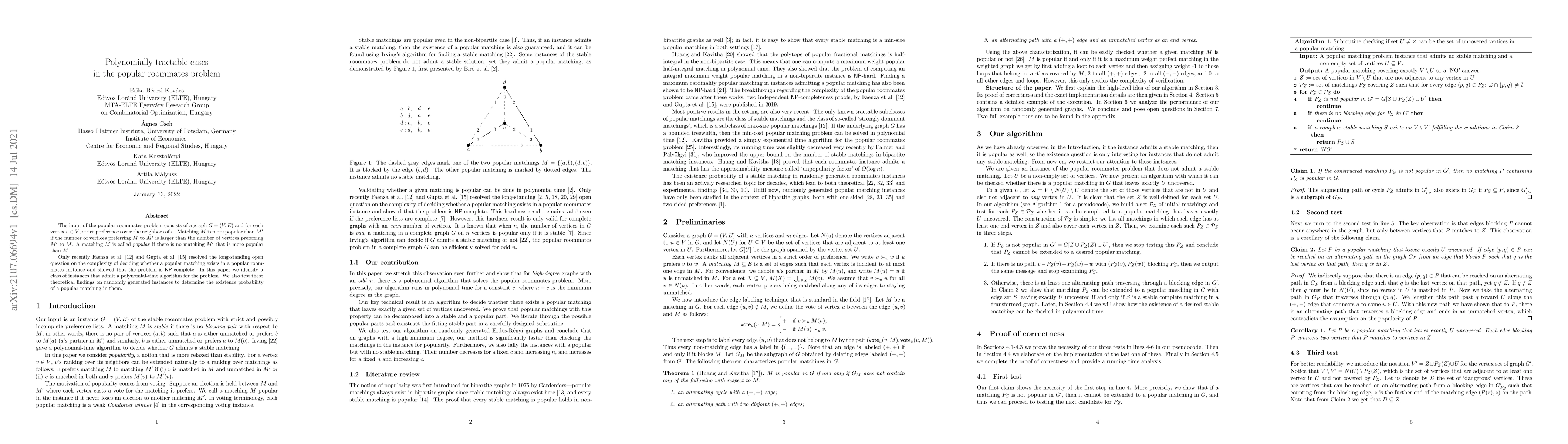 The input of the popular roommates problem consists of a graph $G = (V, E)$ and for each vertex $v\in V$, strict preferences over the neighbors of $v$. Matching $M$ is more popular than $M'$ if the number of vertices preferring $M$ to $M'$ is larger than the number of vertices preferring $M'$ to $M$. A matching $M$ is called popular if there is no matching $M'$ that is more popular than $M$. Only recently Faenza et al. and Gupta et al. resolved the long-standing open question on the complexity of deciding whether a popular matching exists in a popular roommates instance and showed that the problem is NP-complete. In this paper we identify a class of instances that admit a polynomial-time algorithm for the problem. We also test these theoretical findings on randomly generated instances to determine the existence probability of a popular matching in them.