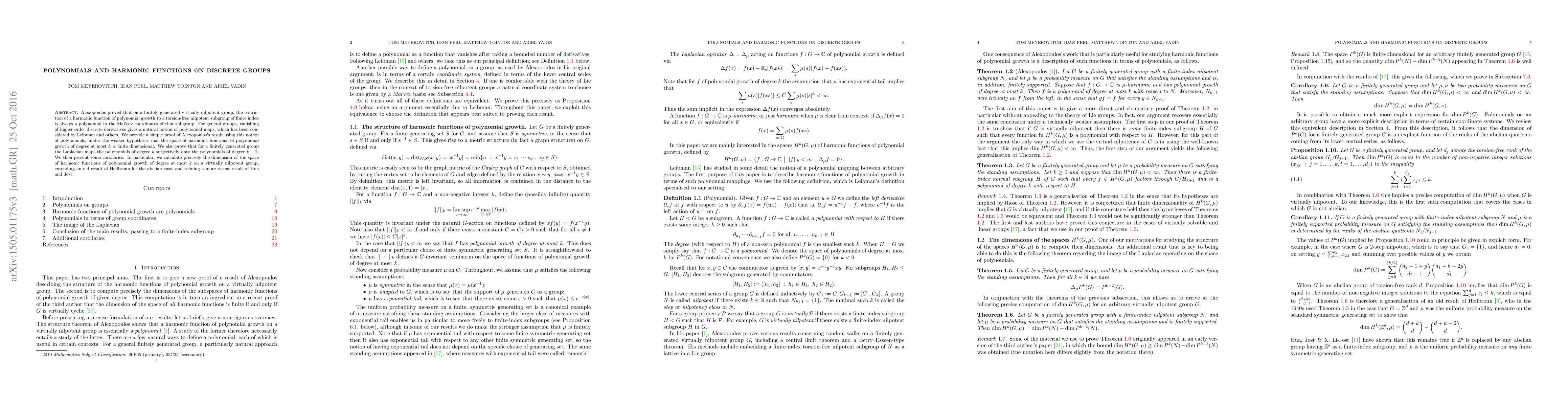 Alexopoulos proved that on a finitely generated virtually nilpotent group, the restriction of a harmonic function of polynomial growth to a torsion-free nilpotent subgroup of finite index is always a polynomial in the Mal'cev coordinates of that subgroup. For general groups, vanishing of higher-order discrete derivatives gives a natural notion of polynomial maps, which has been considered by Leibman and others. We provide a simple proof of Alexopoulos's result using this notion of polynomials, under the weaker hypothesis that the space of harmonic functions of polynomial growth of degree at most k is finite dimensional. We also prove that for a finitely generated group the Laplacian maps the polynomials of degree k surjectively onto the polynomials of degree k - 2. We then present some corollaries. In particular, we calculate precisely the dimension of the space of harmonic functions of polynomial growth of degree at most k on a virtually nilpotent group, extending an old result of Heilbronn for the abelian case, and refining a more recent result of Hua and Jost.