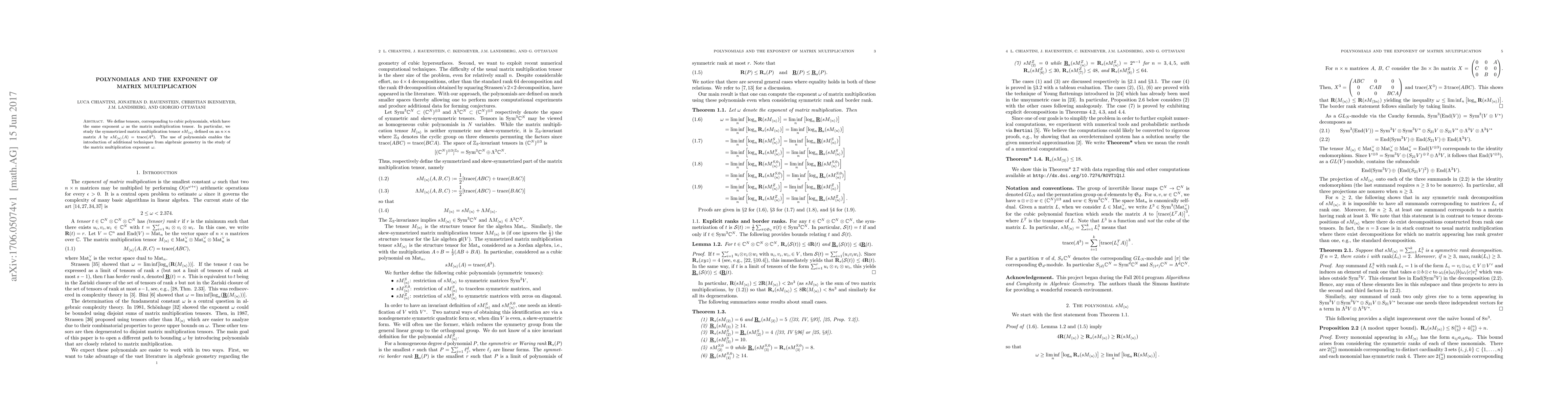 We define tensors, corresponding to cubic polynomials, which have the same exponent $\omega$ as the matrix multiplication tensor. In particular, we study the symmetrized matrix multiplication tensor $sM_n$ defined on an $n\times n$ matrix $A$ by $sM_n(A)=trace(A^3)$. The use of polynomials enables the introduction of additional techniques from algebraic geometry in the study of the matrix multiplication exponent $\omega$.