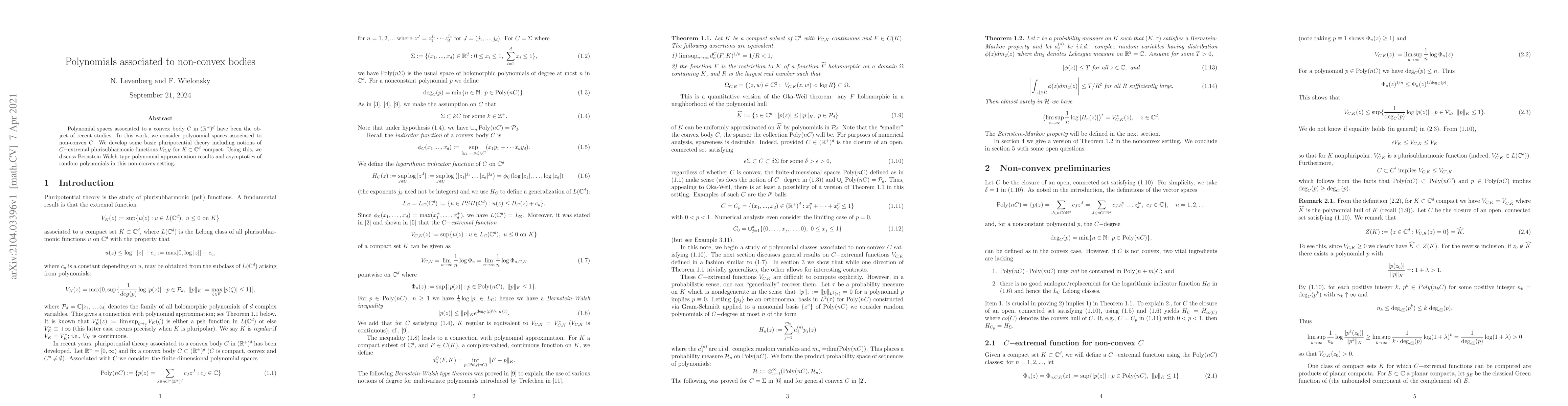 Polynomial spaces associated to a convex body $C$ in $({\bf R}^+)^d$ have been the object of recent studies. In this work, we consider polynomial spaces associated to non-convex $C$. We develop some basic pluripotential theory including notions of $C-$extremal plurisubharmonic functions $V_{C,K}$ for $K\subset {\bf C}^d$ compact. Using this, we discuss Bernstein-Walsh type polynomial approximation results and asymptotics of random polynomials in this non-convex setting.