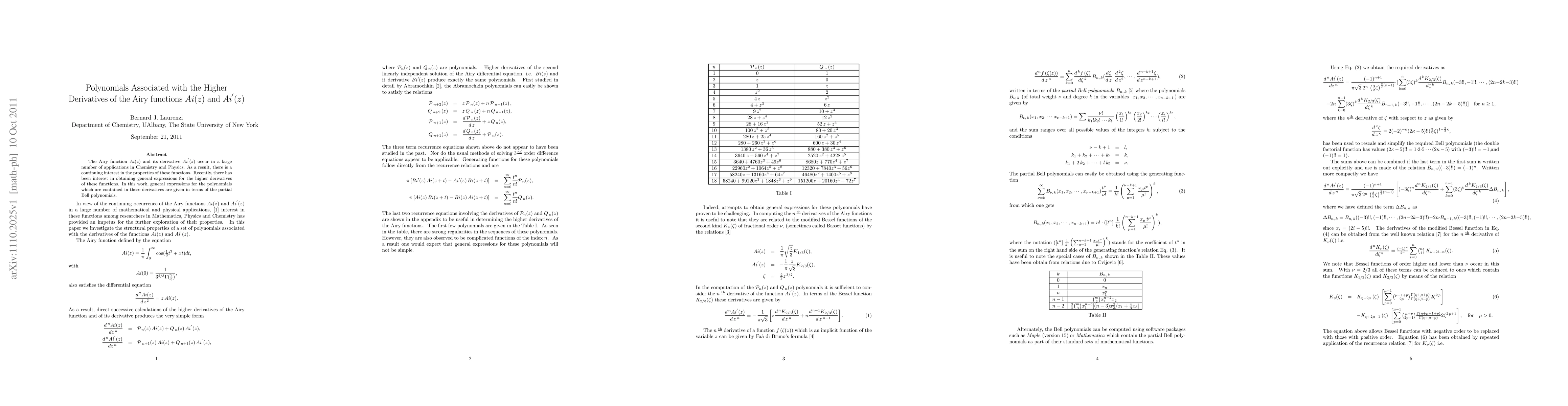 Summary: This paper provides general expressions for the higher derivatives of the Airy functions Ai(z) and Ai'(z) in terms of the partial Bell polynomials, contributing to the understanding of their polynomial components in applications across Chemistry and Physics.
