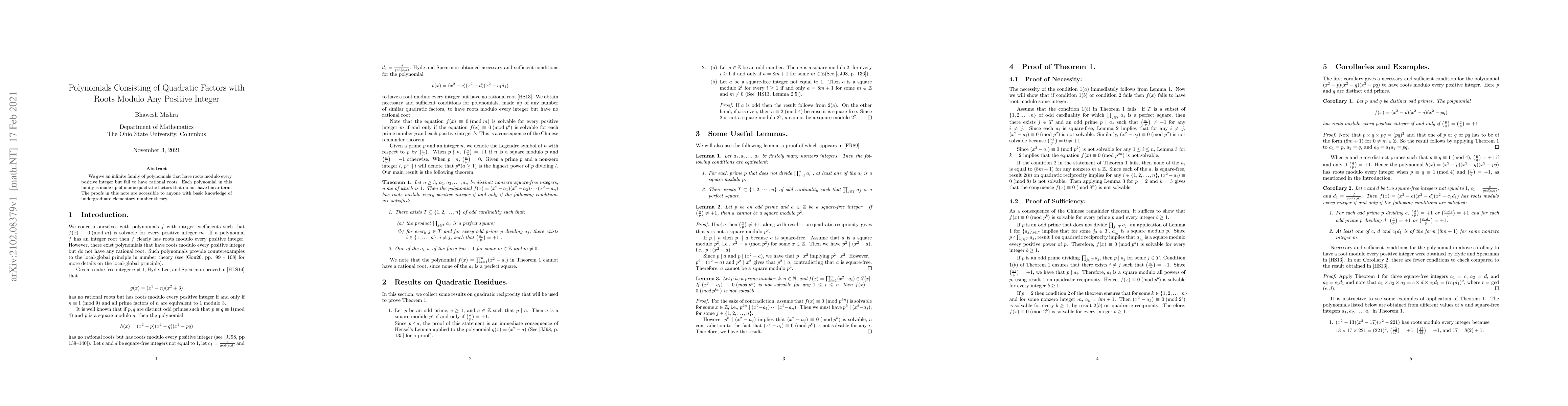 Summary: This paper presents an infinite family of polynomials constructed from monic quadratic factors without linear terms, which have roots modulo any positive integer but lack rational roots. These polynomials demonstrate unique properties in modular arithmetic.