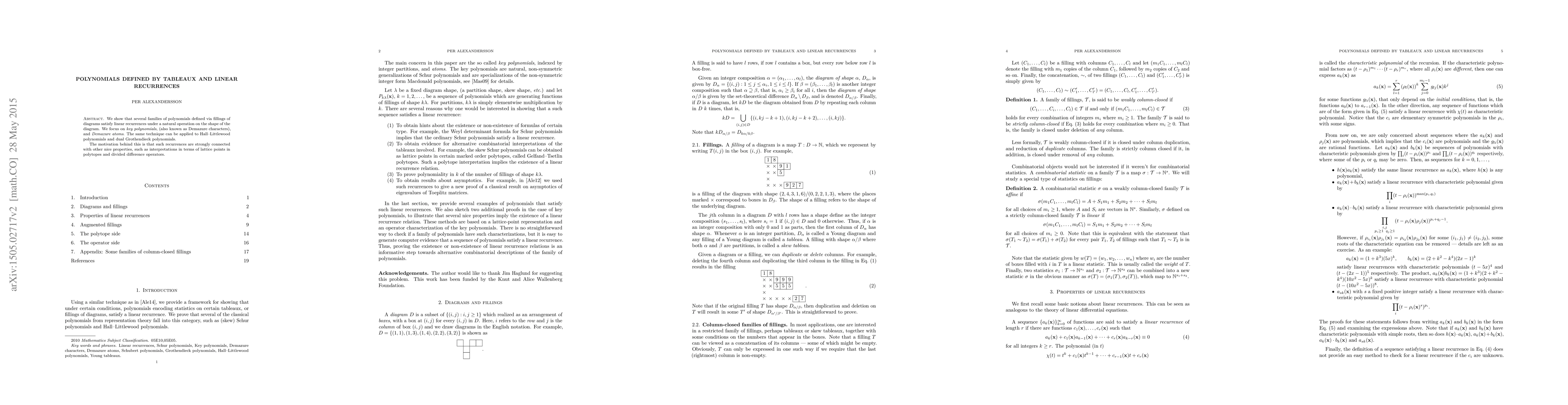 Researchers discovered that certain polynomials defined by diagram fillings satisfy linear recurrences, a property connected to interpretations in lattice points and divided difference operators.