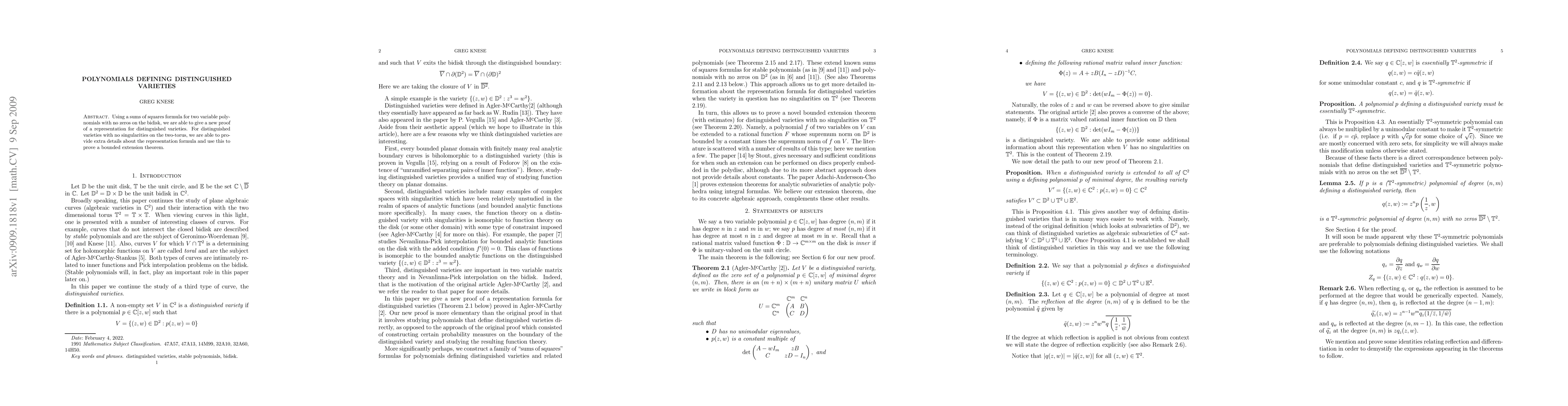 This paper presents a new proof for the representation of distinguished varieties using sums of squares for two-variable polynomials without zeros on the bidisk. It also provides additional details for varieties on the two-torus and proves a bounded extension theorem.