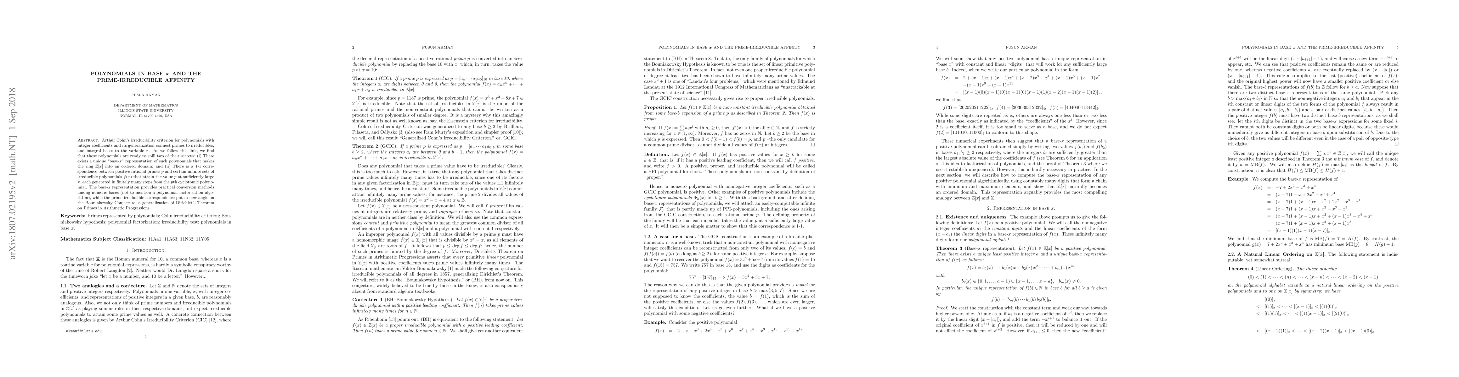 Arthur Cohn's irreducibility criterion for polynomials with integer coefficients and its generalization connect primes to irreducibles, and integral bases to the variable $x$. As we follow this link, we find that these polynomials are ready to spill two of their secrets: (i) There exists a unique "base-$x$" representation of such polynomials that makes the ring $\mathbb{Z}[x]$ into an ordered domain; and (ii) There is a 1-1 correspondence between positive rational primes $p$ and certain infinite sets of irreducible polynomials $f(x)$ that attain the value $p$ at sufficiently large $x$, each generated in finitely many steps from the $p$th cyclotomic polynomial. The base-$x$ representation provides practical conversion methods among numeric bases (not to mention a polynomial factorization algorithm), while the prime-irreducible correspondence puts a new angle on the Bouniakowsky Conjecture, a generalization of Dirichlet's Theorem on Primes in Arithmetic Progressions.