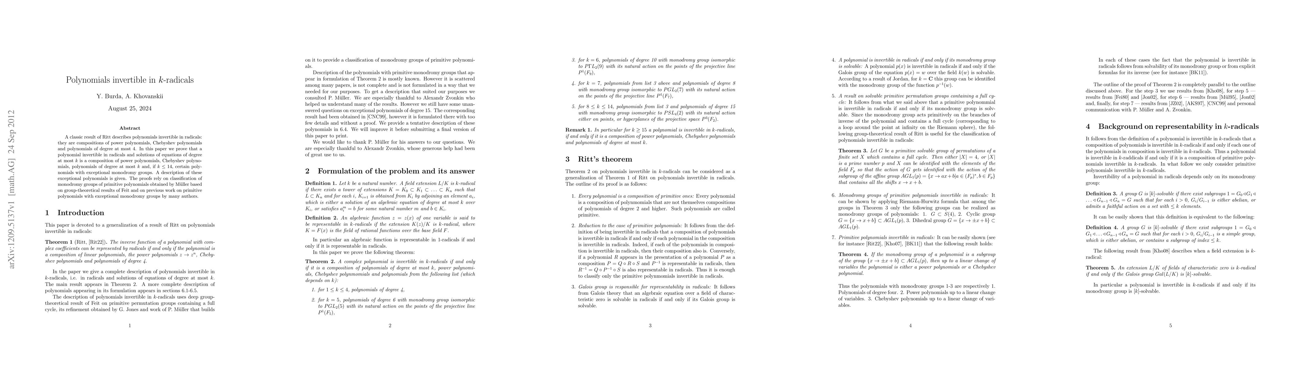 A classic result of Ritt describes polynomials invertible in radicals: they are compositions of power polynomials, Chebyshev polynomials and polynomials of degree at most 4. In this paper we prove that a polynomial invertible in radicals and solutions of equations of degree at most k is a composition of power polynomials, Chebyshev polynomials, polynomials of degree at most k and, if k < 15, certain polynomials with exceptional monodromy groups. A description of these exceptional polynomials is given. The proofs rely on classification of monodromy groups of primitive polynomials obtained by M\"{u}ller based on group-theoretical results of Feit and on previous work on primitive polynomials with exceptional monodromy groups by many authors.